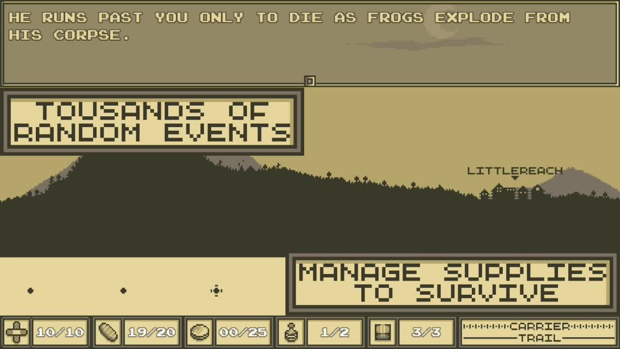 Take control of a courier delivering an important package to the royal family! Search for loot, make enemies, tell jokes, solve mysteries, trip over logs, and much more in this randomly-generated, whimsical, fantasy adventure! Inspired by Oregon Trail, you'll never get the same adventure twice!