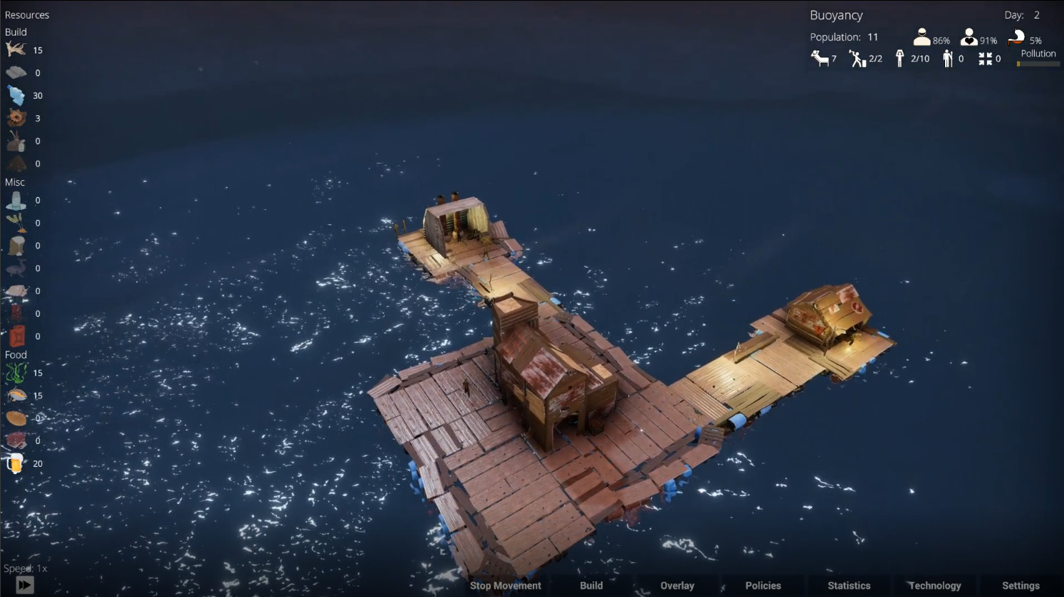 Buoyancy is a city-building strategy game where you build, manage, and move a floating city on an oceanic world. Explore and scavenge resources scattered around the endless waters. Keep your villagers nourished and happy while combating fires, sickness, and pirate attacks.
