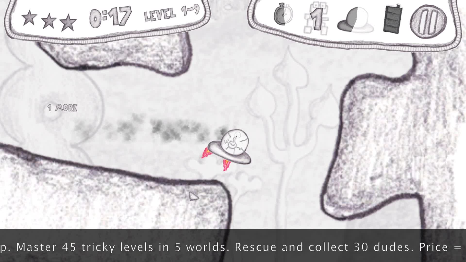 Navigate a fragile space ship through dangerous caverns. Hand-drawn. From easy to super tricky in 5 worlds.