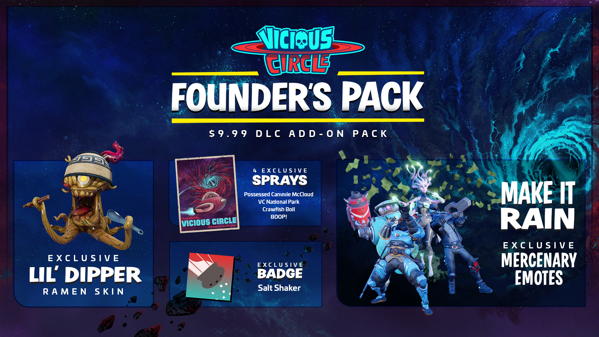 The Founder's pack offers several exclusive items including sprays, badges, and the amazing Ramen skin for the Lil' Dipper.