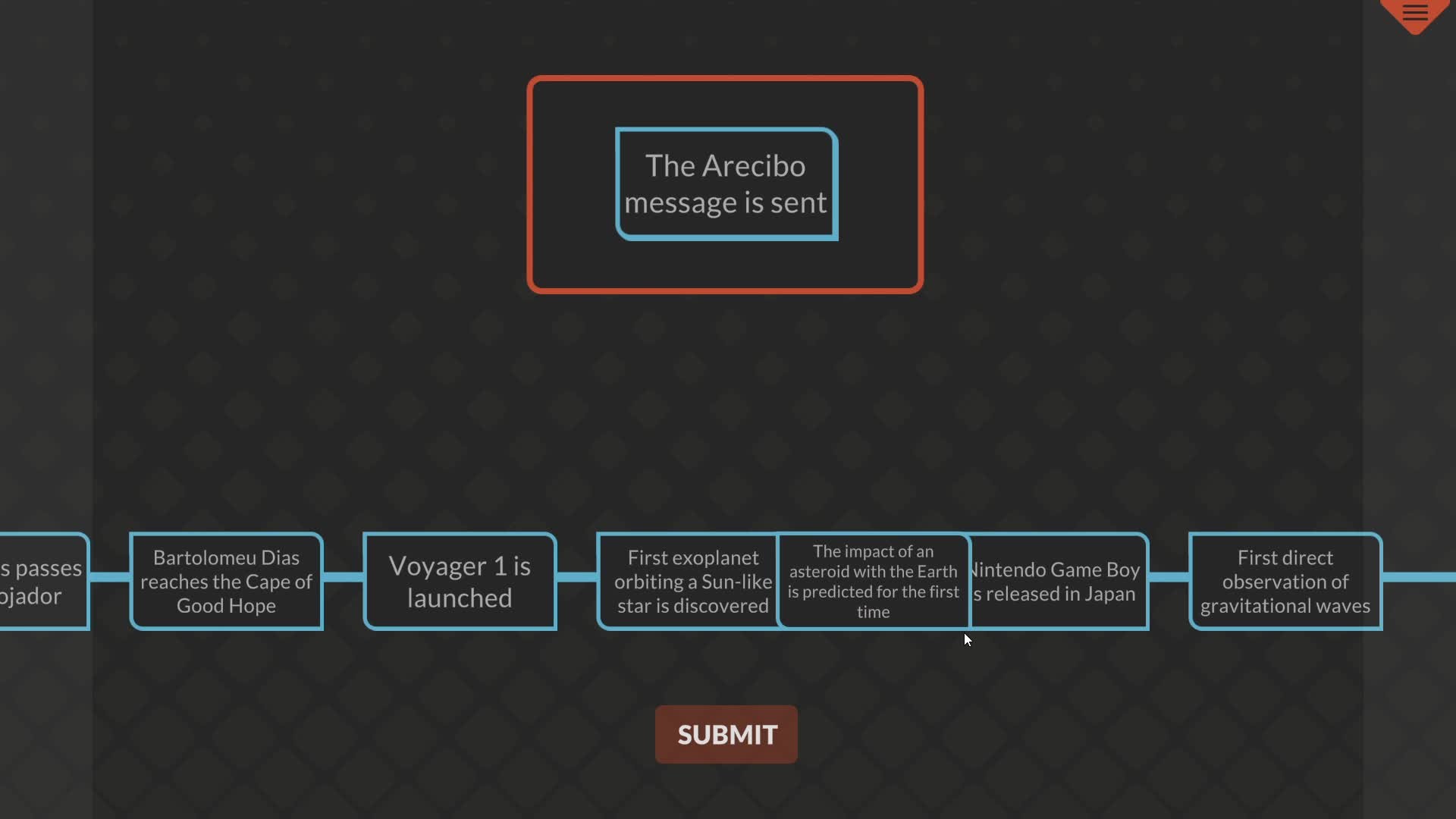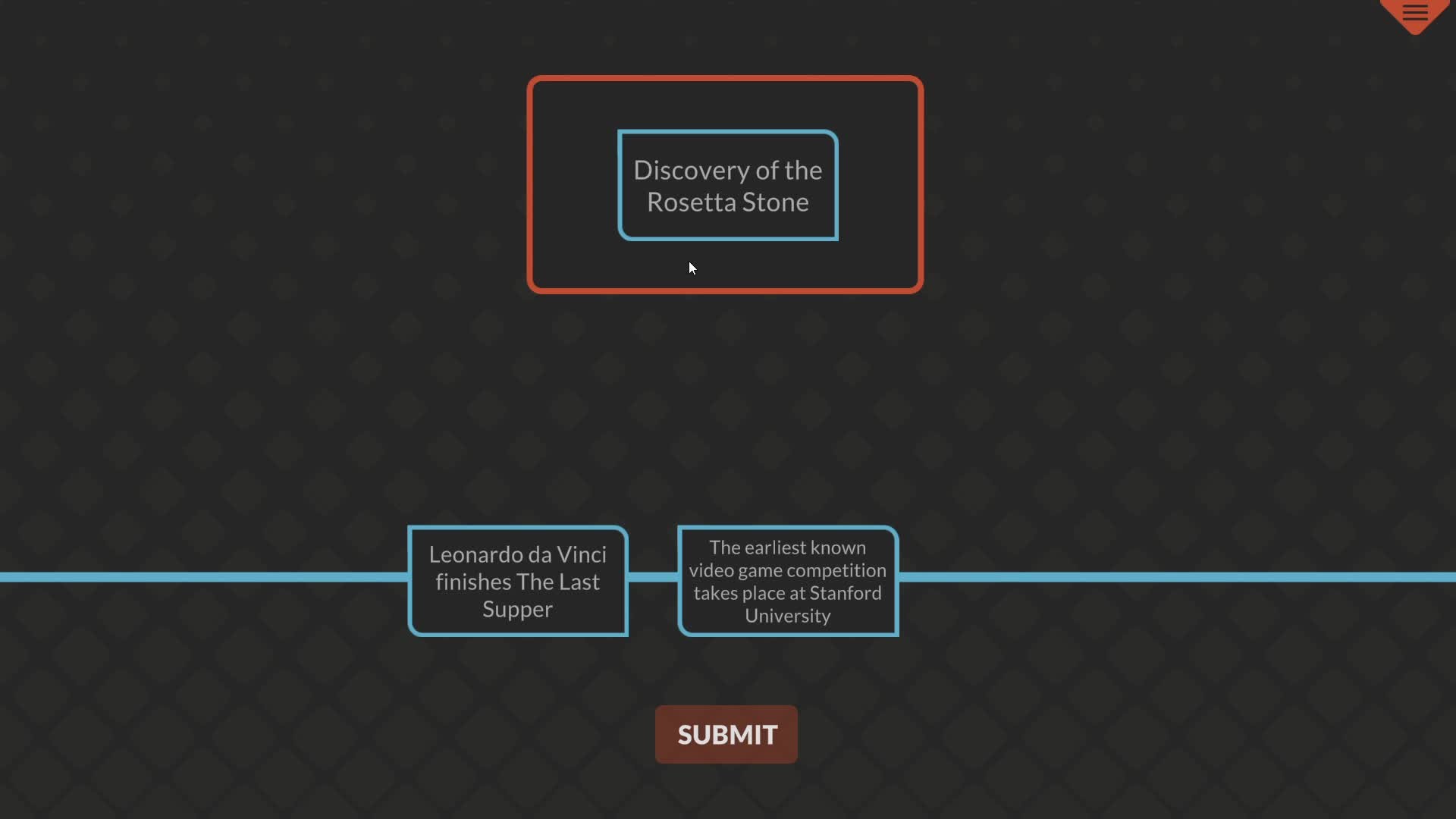 Drag and drop the historic events cards onto the timeline, arranging them from earliest to latest. Put all the events in correct chronological order to beat the level and unlock the next challenge.