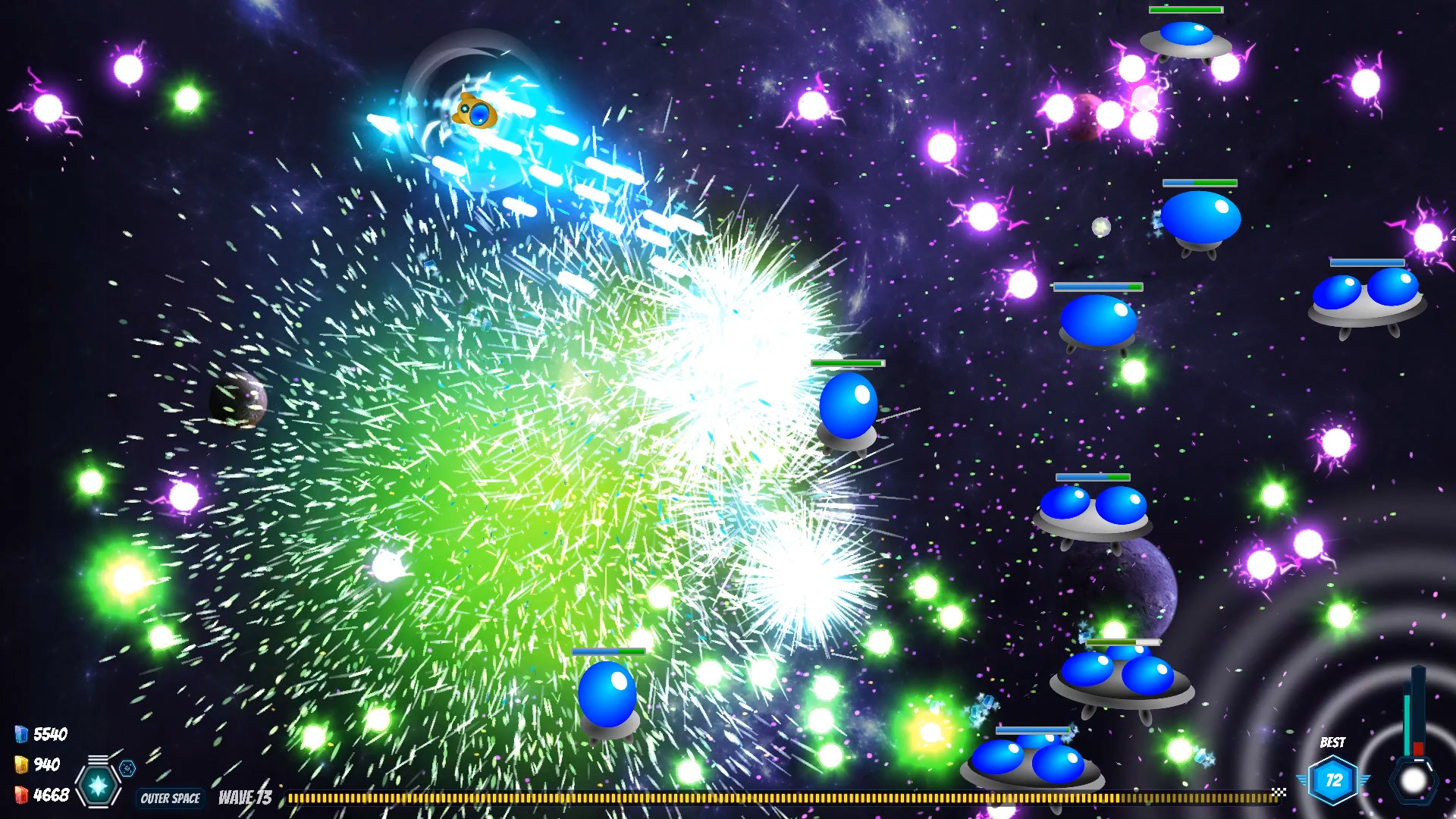 Old school is still extremely cool in the far future but spaceships have to get with the times to survive. Blast your way through space in this evolving twin-stick arcade-style shooter with an accessible attitude and a heart of titanium.