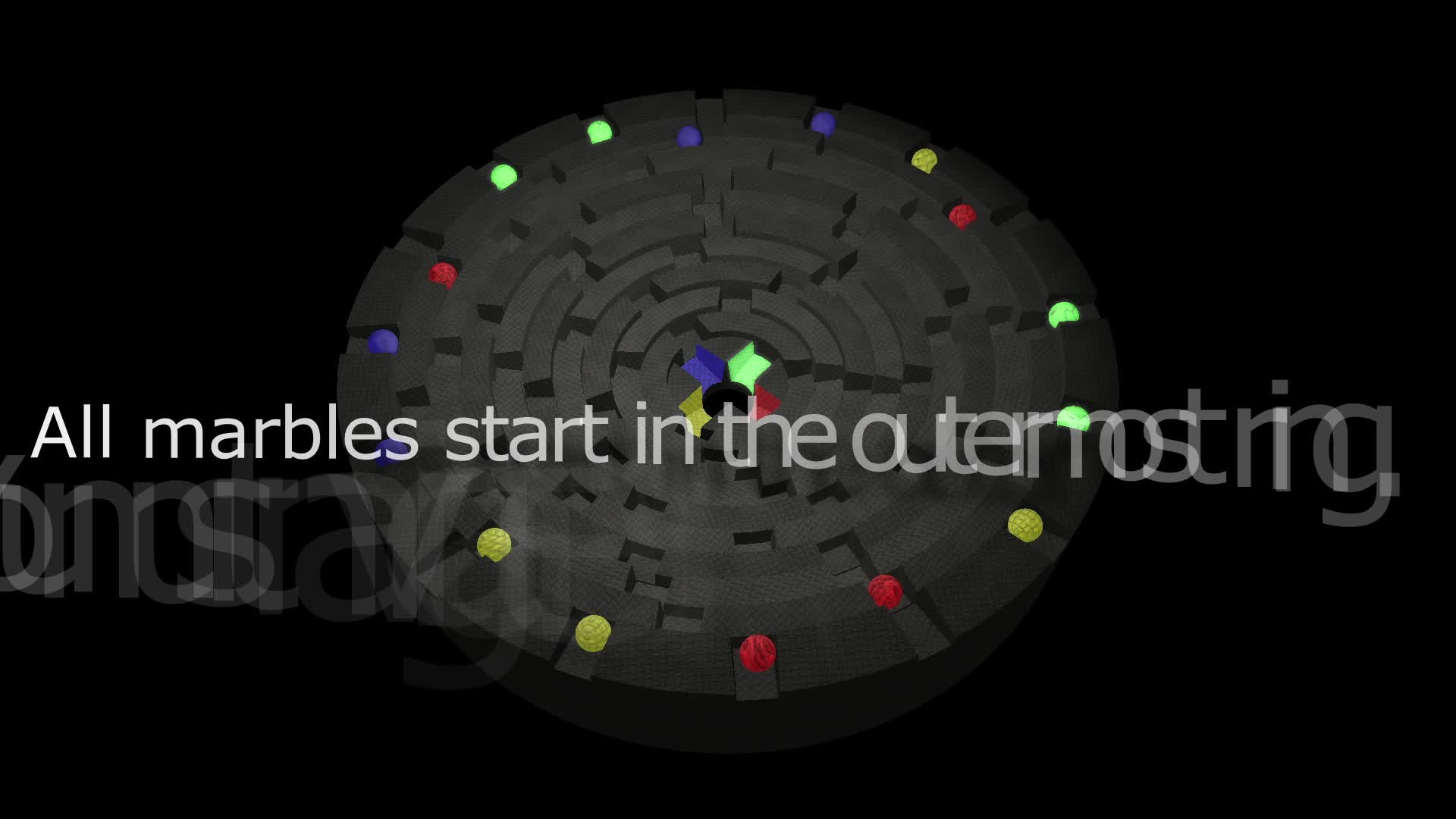 A simple strategy game: rotate a ring, align the notches and your marbles fall towards the center. Drop all your marbles through the central hole and you win.