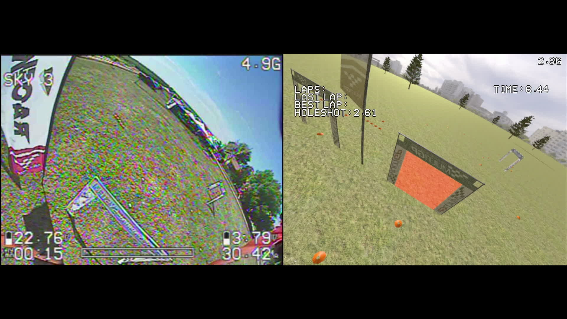 This simulator is a true FPV Drone Racing simulator. The goal is to make it look and feel as similar to a standard racing drone as possible. As such, the goal is not to make the most HD/GoPro-esque visuals. Instead the focus is on simulating what pilots see through the goggles, static and all!