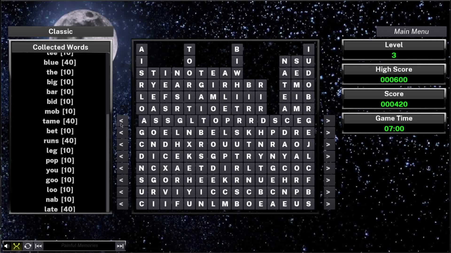 Inspired by the *tris family of games as well as the word search of the world, InfiniWordSlide gives you a score attack that will test your knowledge of the language, your ability to quickly react and reward good strategy. The controls are simple and the mechanics clear.