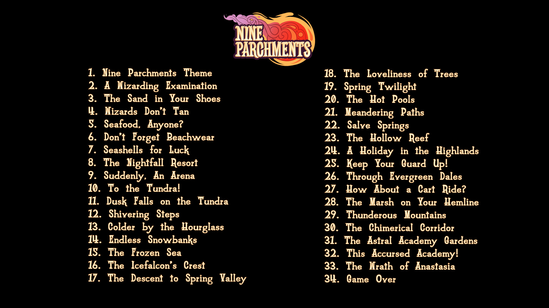 The Original Soundtrack to Nine Parchments. Includes 34 original tracks, totaling at over 2 hours of beautiful fantasy-themed music!