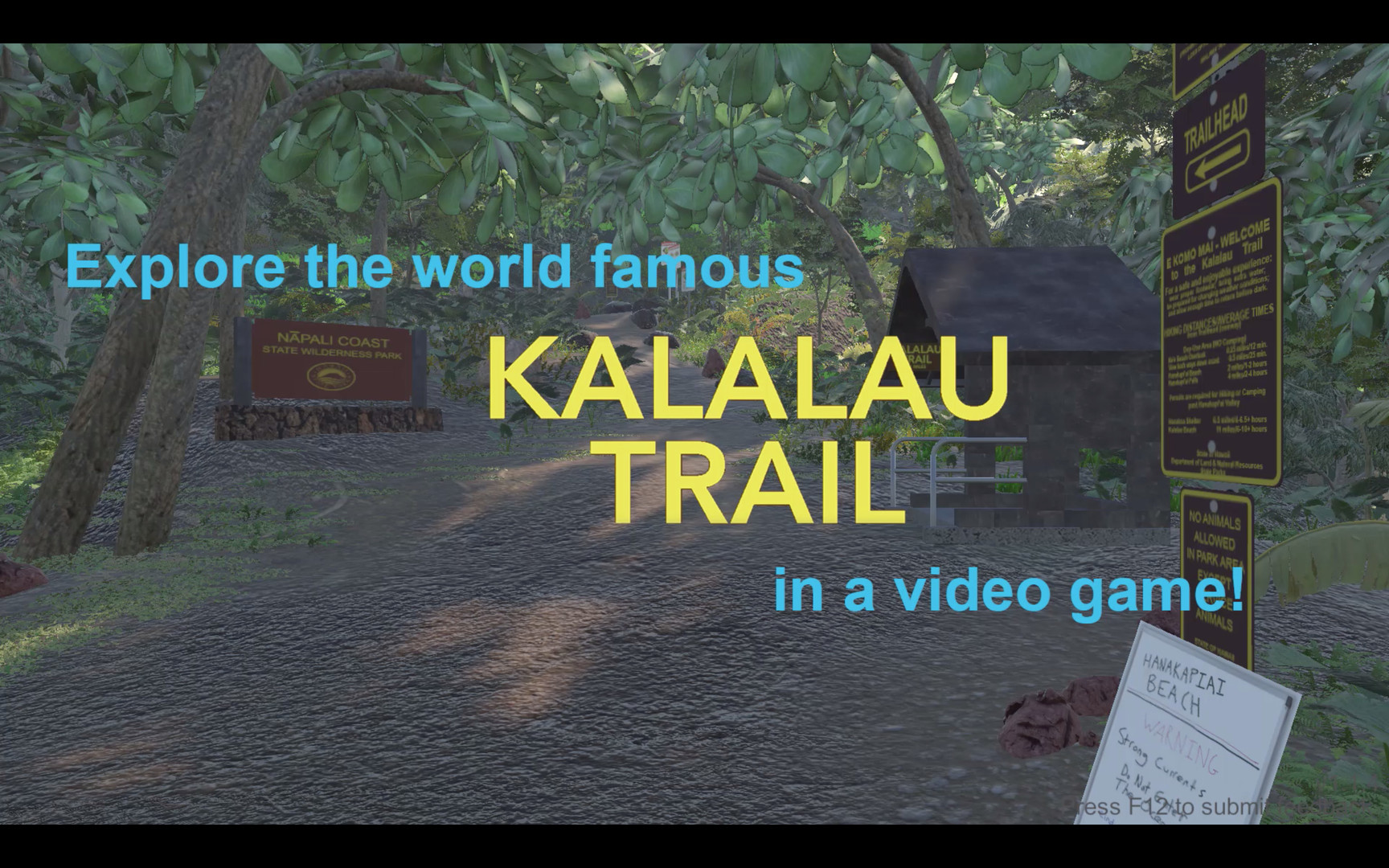 A first-person 3D version of the famous Kalalau Trail on the Hawaiian island of Kauai. Vast open world includes the full length of the trail. Many surprises and easter eggs, many famous sights along the trail.