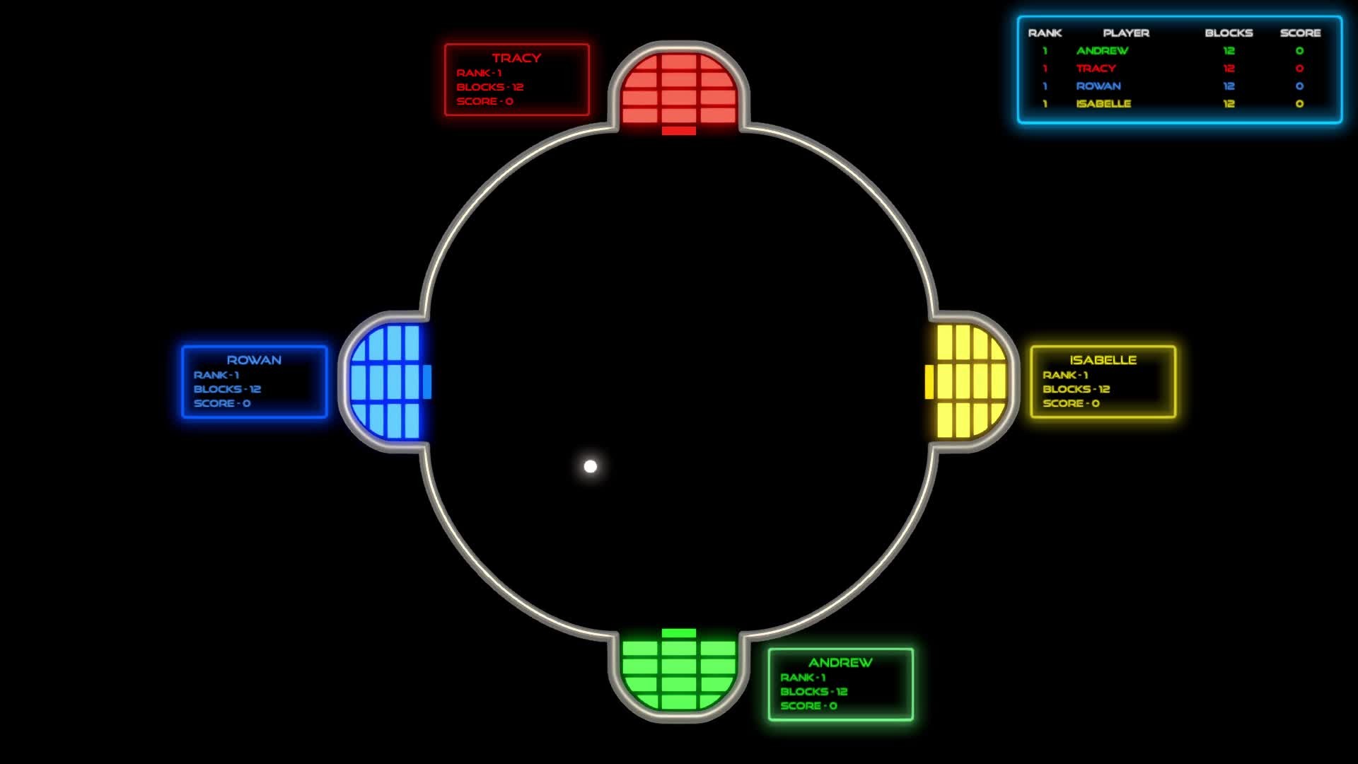 Whizz Ball is a high speed cross between Pong, Breakout and Pinball. Play against your friends with 4 player local support, or play single player against the computer.