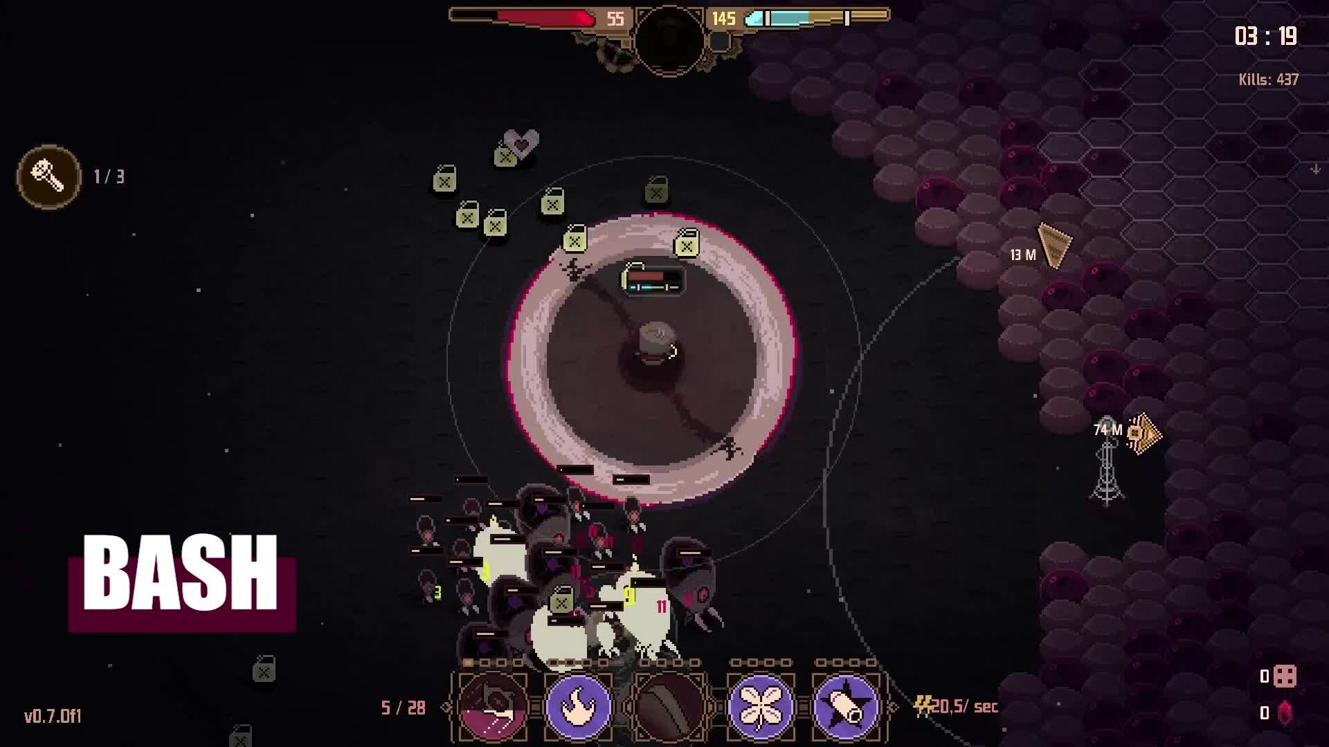 Swarm Grinder is an action roguelite game with pixel art graphics. Battle enemies to make your way through a mass of spreading and evolving cells hosting dormant enemies. Collect a variety of game-changing skills and upgrades to create unique builds.