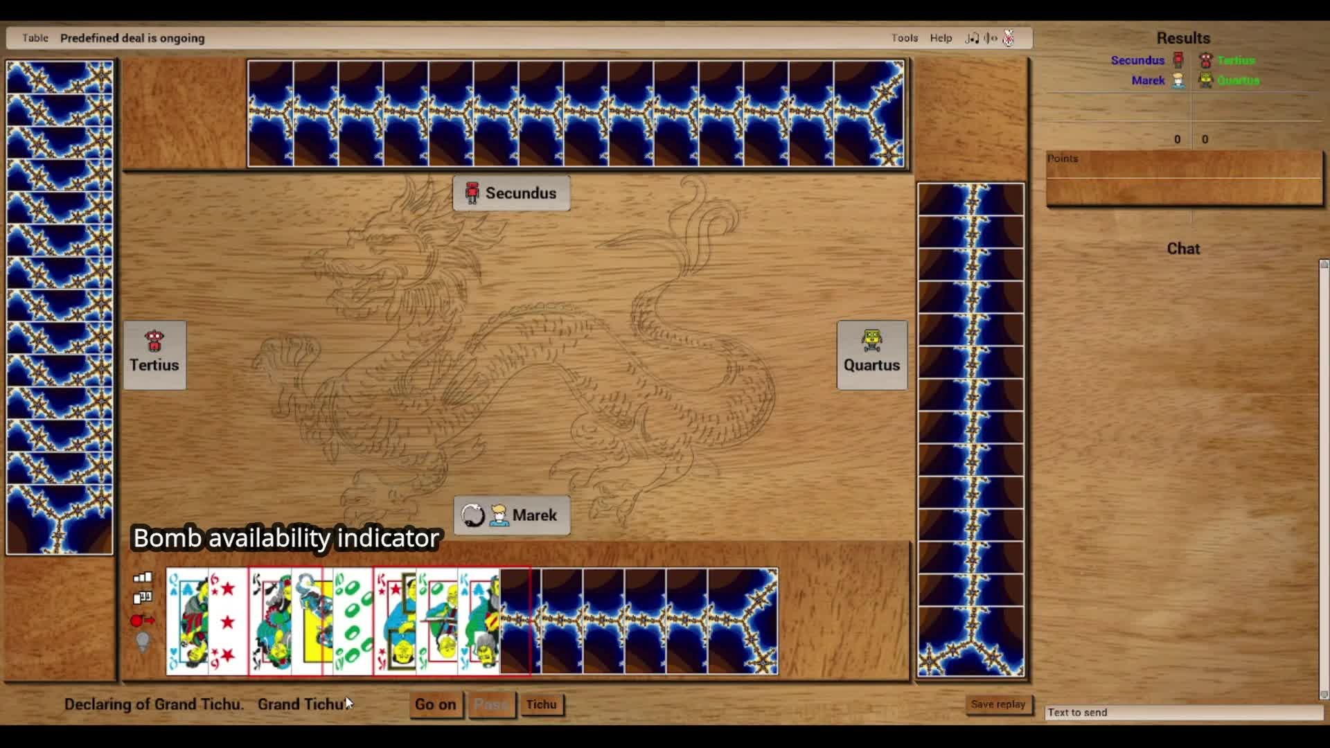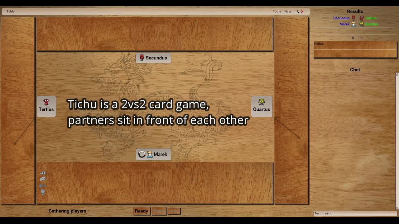 Computer edition of Tichu card game in which teams of two play against each other. You can play with your friends on the Internet or with computer. Voice chatting in the game is supported.