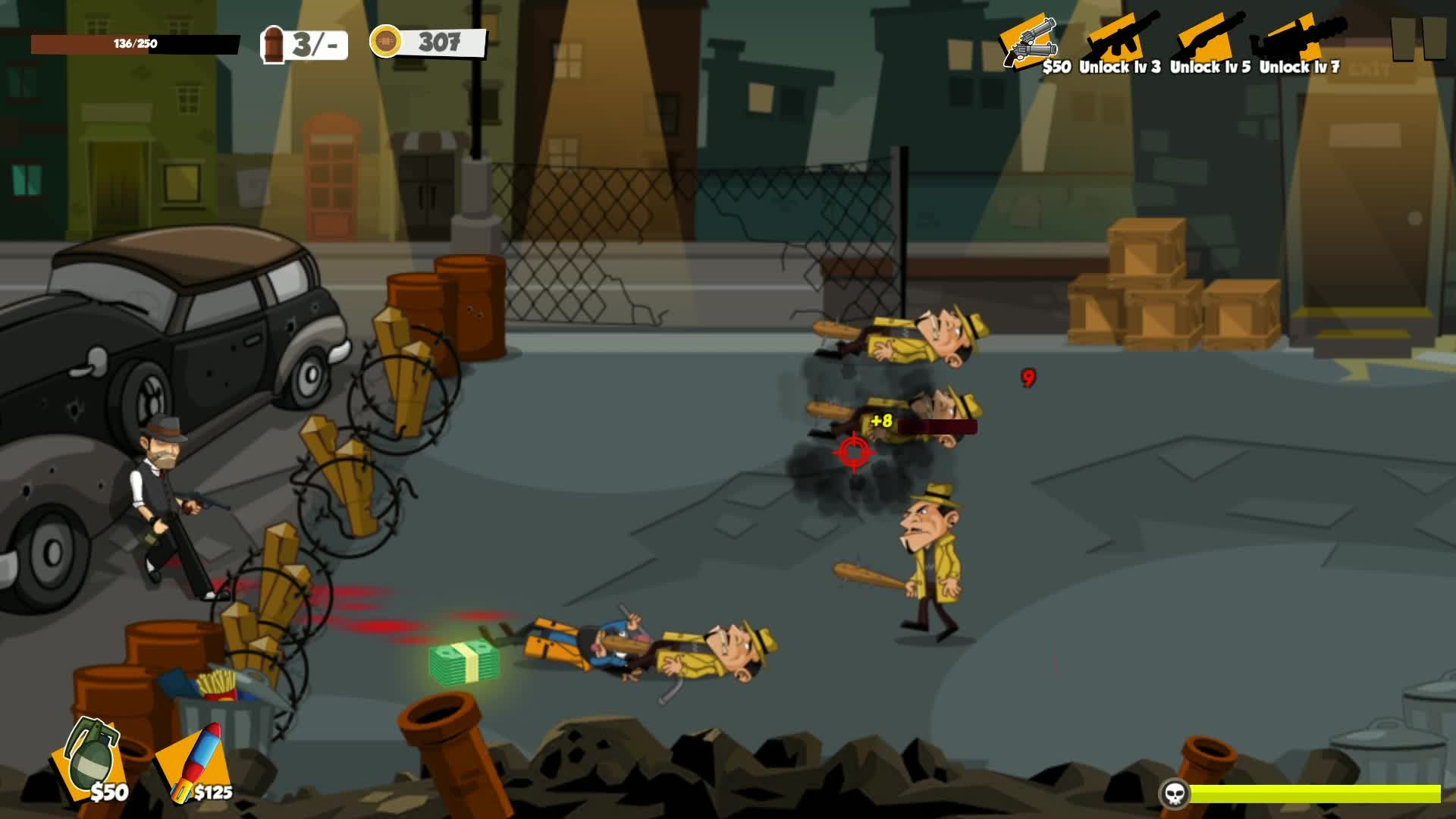 Crazy Mafioso is a addicting multi-level survival game. Don`t let yourself be killed! Upgrade your barricades, weapons and gun power. Kill and earn game money.