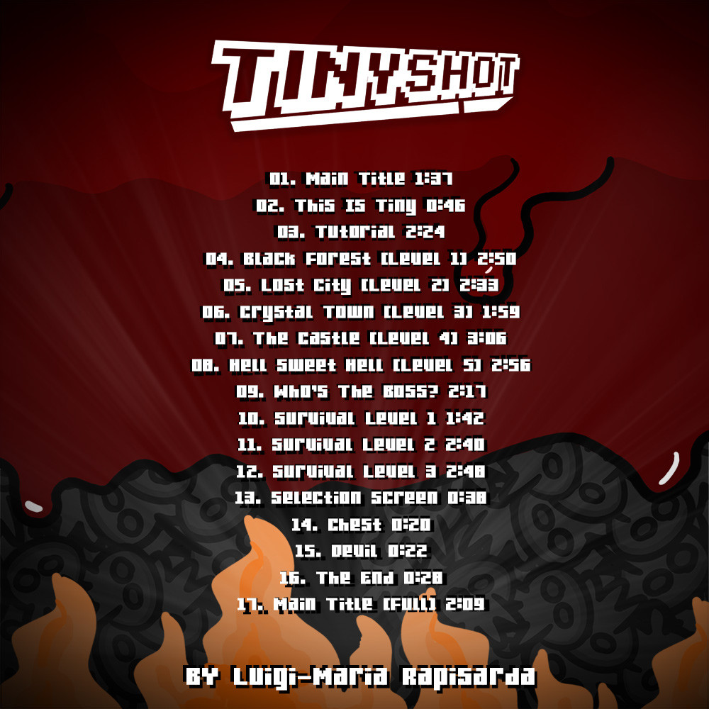 The Official TinyShot Soundtrack includes a collection of 17 atmospheric tracks from the game's arcade shooting action. All tracks are composed by Luigi-Maria Rapisarda.