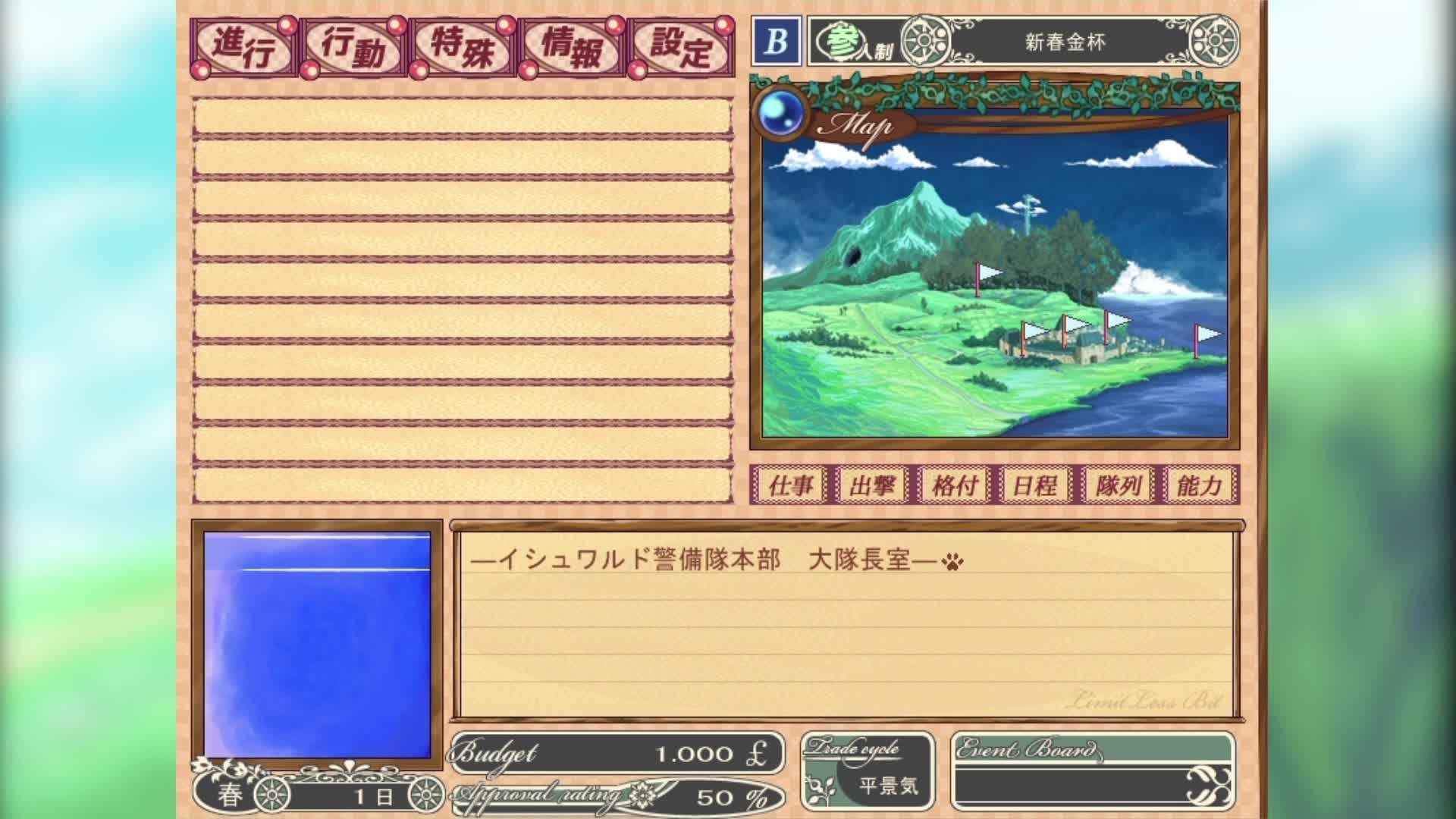 多くの冒険者や観光客が訪れるイシュワルド王国の大都市イシュワルド。このイシュワルドの治安を守る警備隊が今回のメインステージ。 リミットレスビットは、才能ある隊員を集め、成長させ、大会を勝利し、最強の部隊を作ることが目的のゲームです。