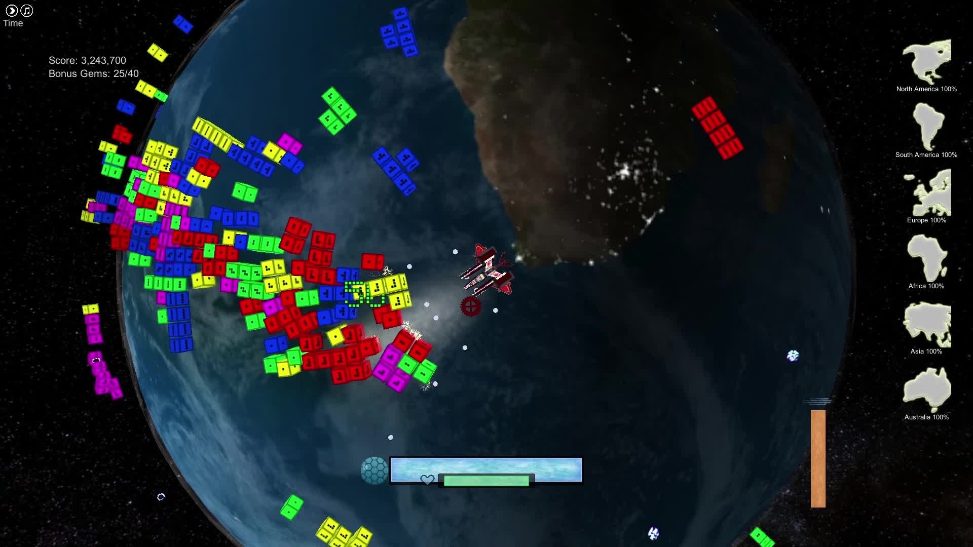 A third person arcade shooter set in orbit above earth. Craft and find puzzle blocks to liberate captured alien continents. Defend yourself and your blocks from constant alien attacks and avoid a variety of obstacles and disasters. Watch out for the enemy bosses when you liberate a continent!