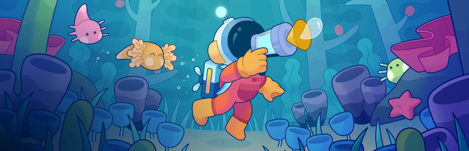 Play as an interstellar custodian sent to clean up a polluted ocean planet. Pick up trash, explore the vibrant waters, and take care of axolotl-like alien creatures!