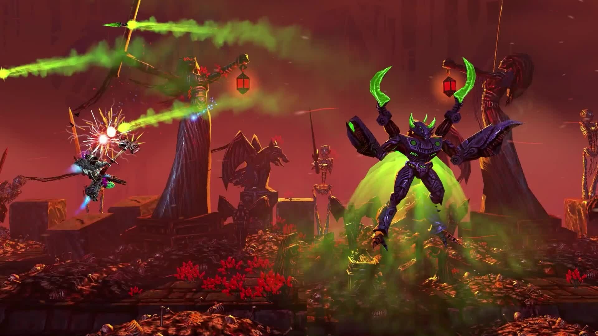 Therion returns as the hunt for Lord Vroll continues. Pilot an advanced machine of death and destruction in this explosive 2.5D side-scrolling shoot ‘em up, and sequel to the critically acclaimed Valfaris. Strap in and unleash mecha hell!