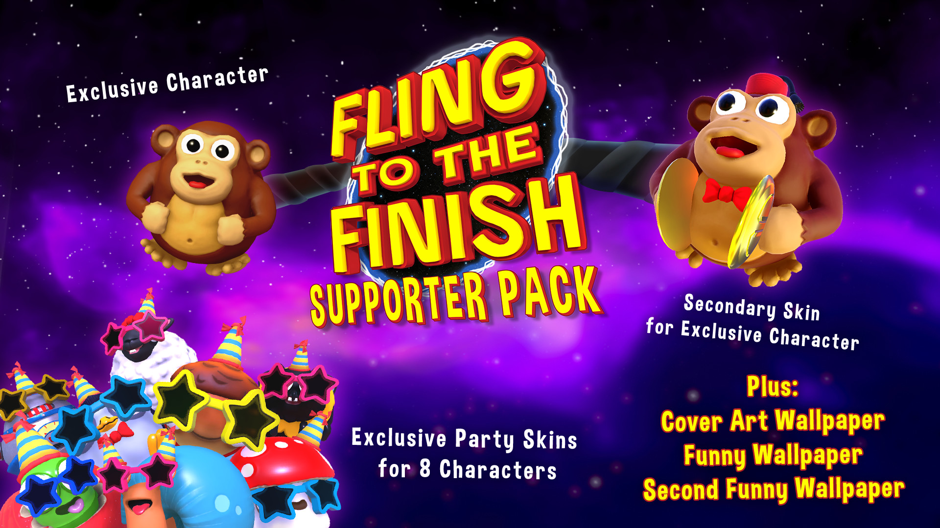 The supporter pack contains a selection of goodies for Fling to the Finish, for all those who want to go the extra mile to support the developer of the game