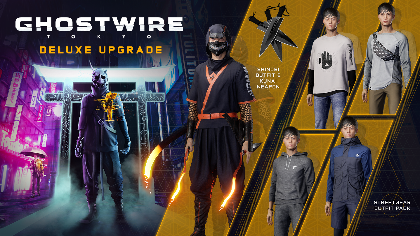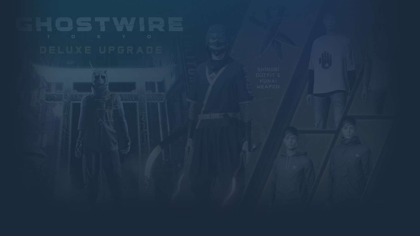 Face the Unknown with style. The Ghostwire: Tokyo Deluxe Upgrade gives you the versatile Streetwear Outfit Pack or hide in the shadows with the Shinobi Outfit and Kunai weapon skin!