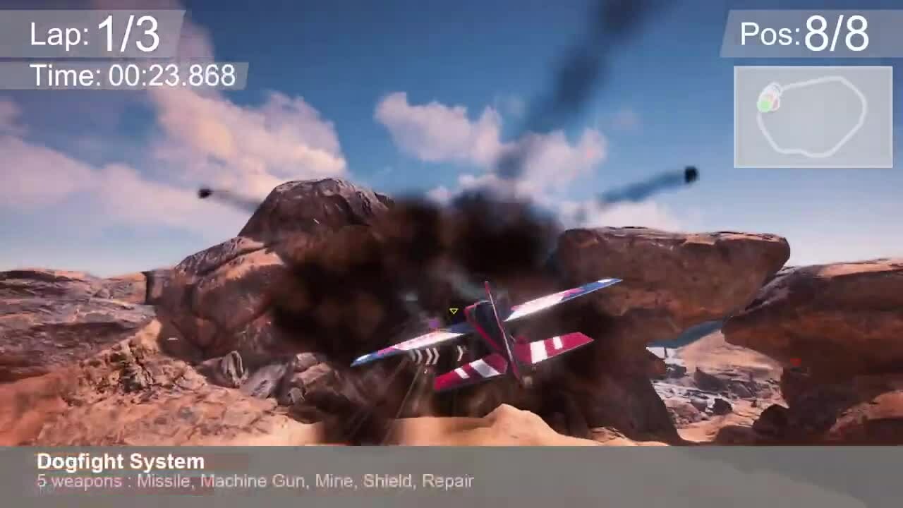 Shoot a machinegun, Launch missiles, Place mines, shield and repair your plane in the Dogfight Airplane racing game. Now compete in Championship, Arcade and Time Trial against the toughest Enemy Ai. Unlock Tracks and Planes to get the highest score on the local leaderboard