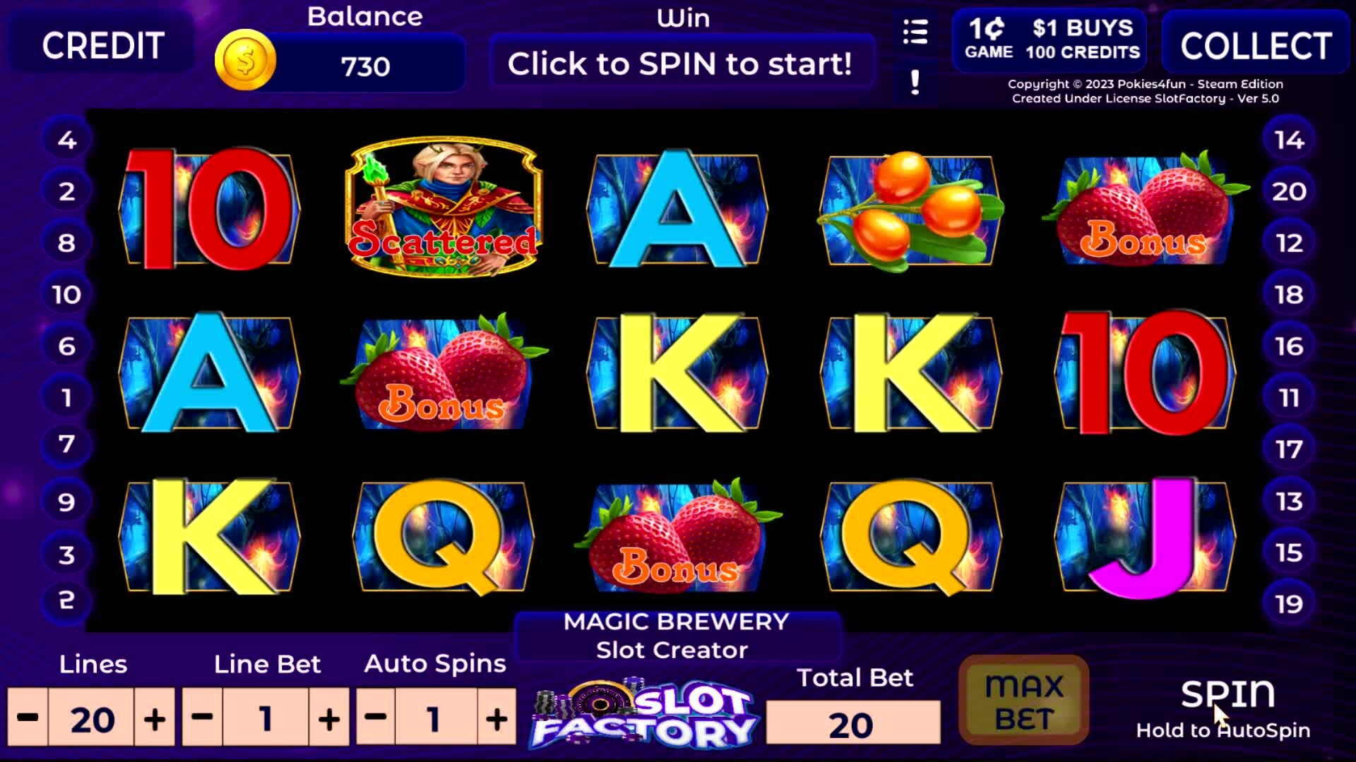 Slot Factory Bigger, Better, Brighter, and easier to create and play. Ever wanted to create a slot game but did know how to program. Here is the next best thing. Pokies4fun have Licensed the game engine to Slot Factory to create a slot making game for the gaming community now includes 7 Themes.