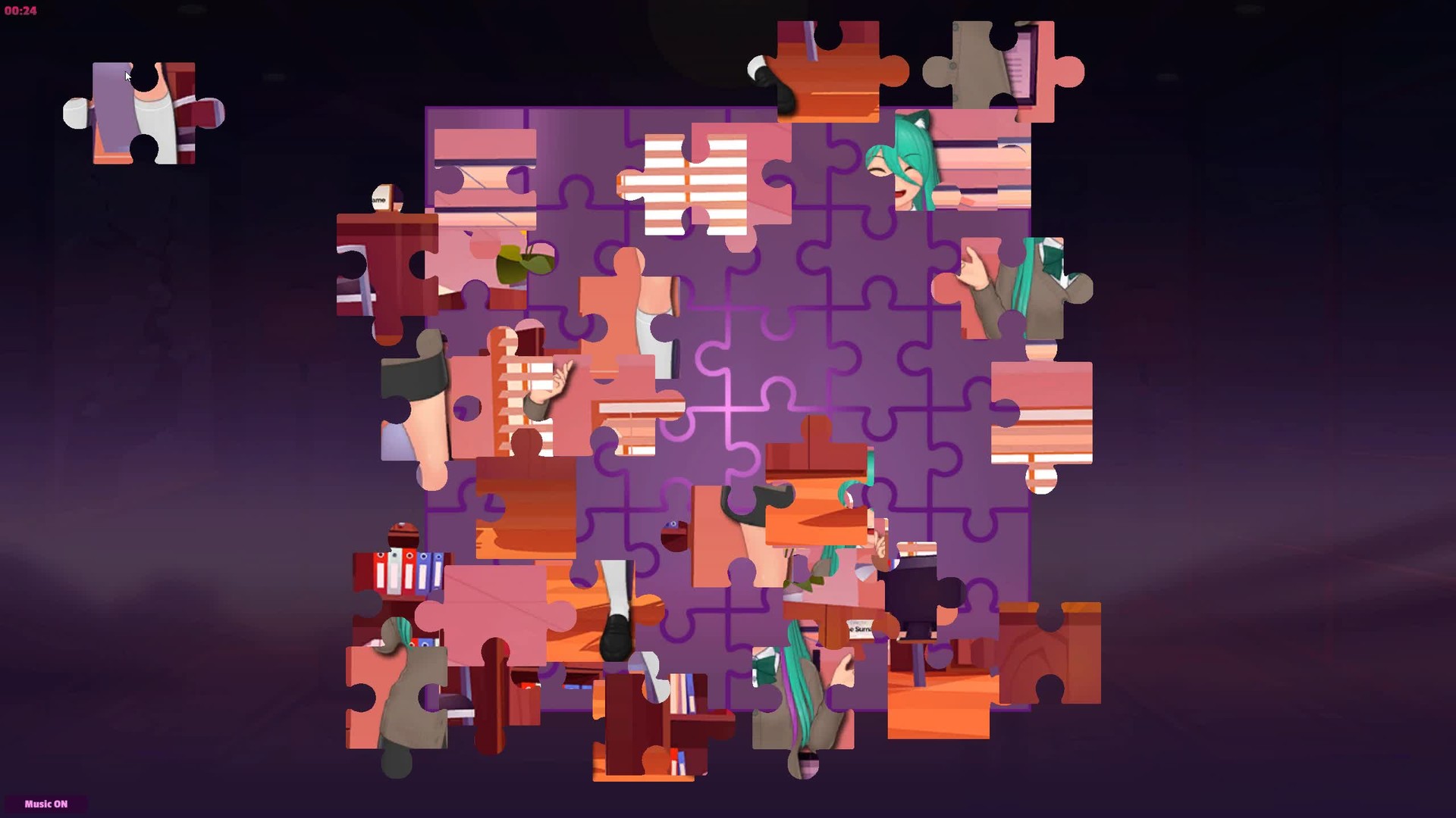 Challenging jigsaw puzzles, featuring sexy anime girls in an office setting. Relaxing background music to match the theme and mood.