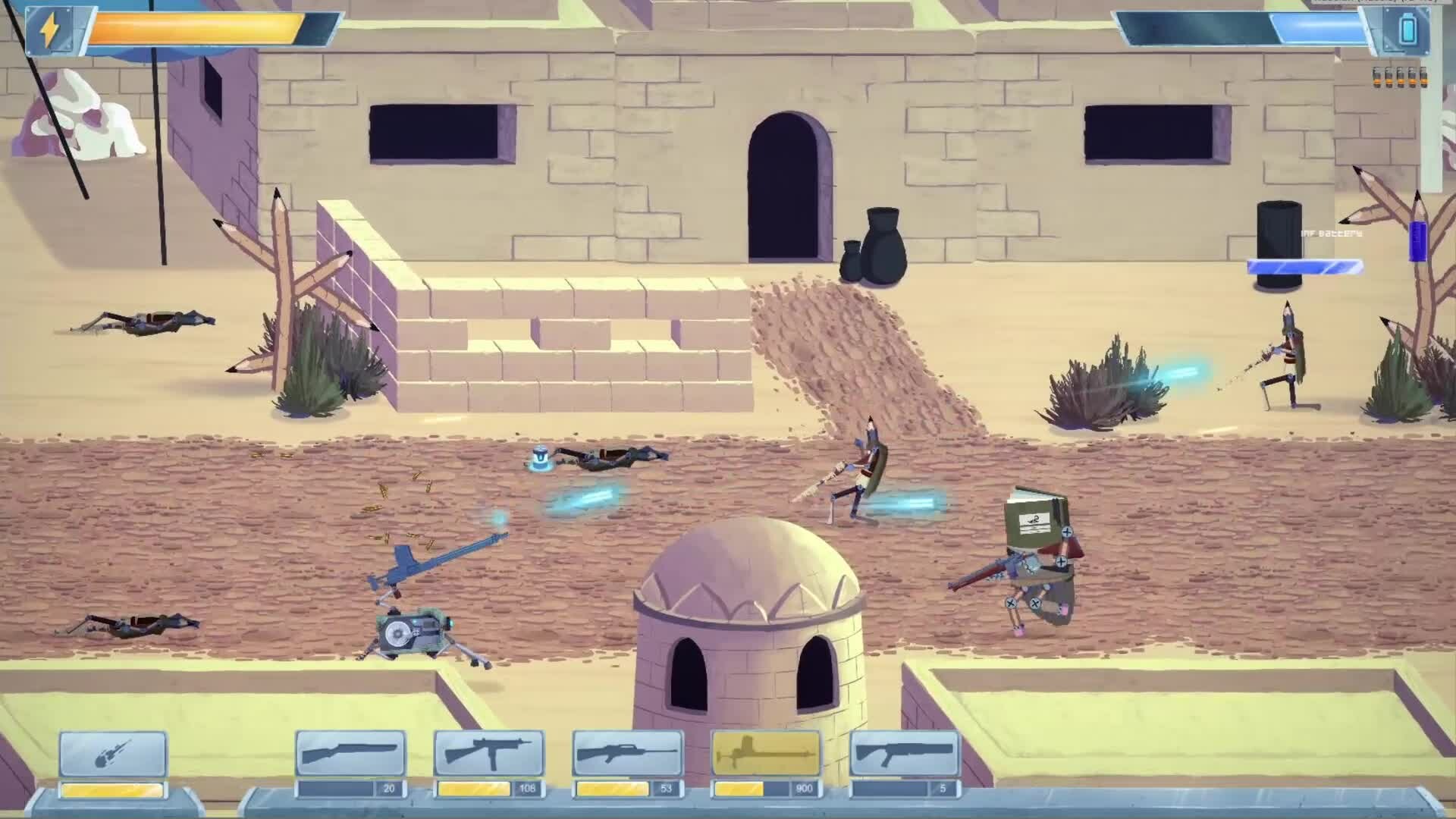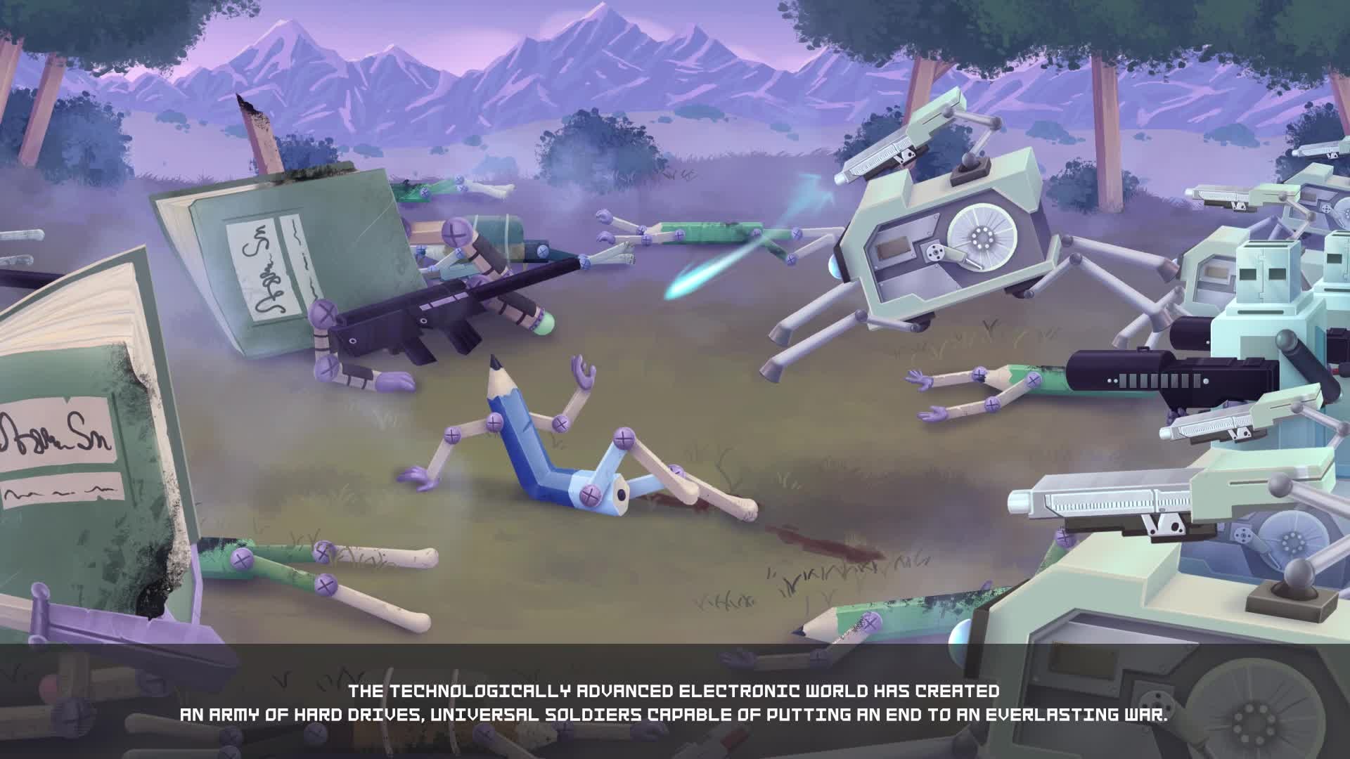A 2D Run'N'Gun shooter set in a two-way universe where Electronic circuits are at war with the world of Books. You are a hard drive miraculously surviving a battle and reborn on a pencil’s farm. Fight with sharpeners, pens and other primitives to destroy King B.