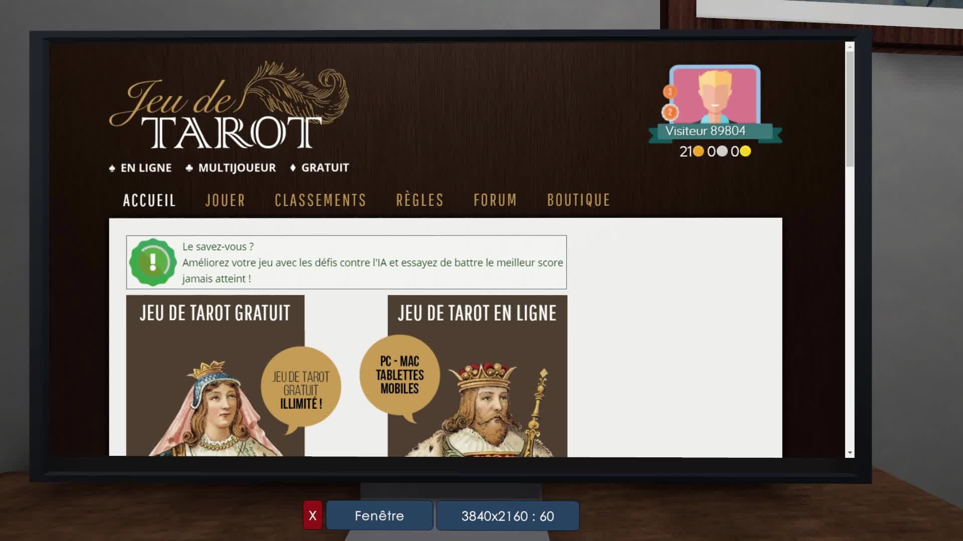 [This game is a French game not translated in english]Jeu de Tarot vous permet de jouer au tarot français, à 4 joueurs, 5 joueurs, mais aussi aux variantes à 3 et 6 joueurs, moins connues.