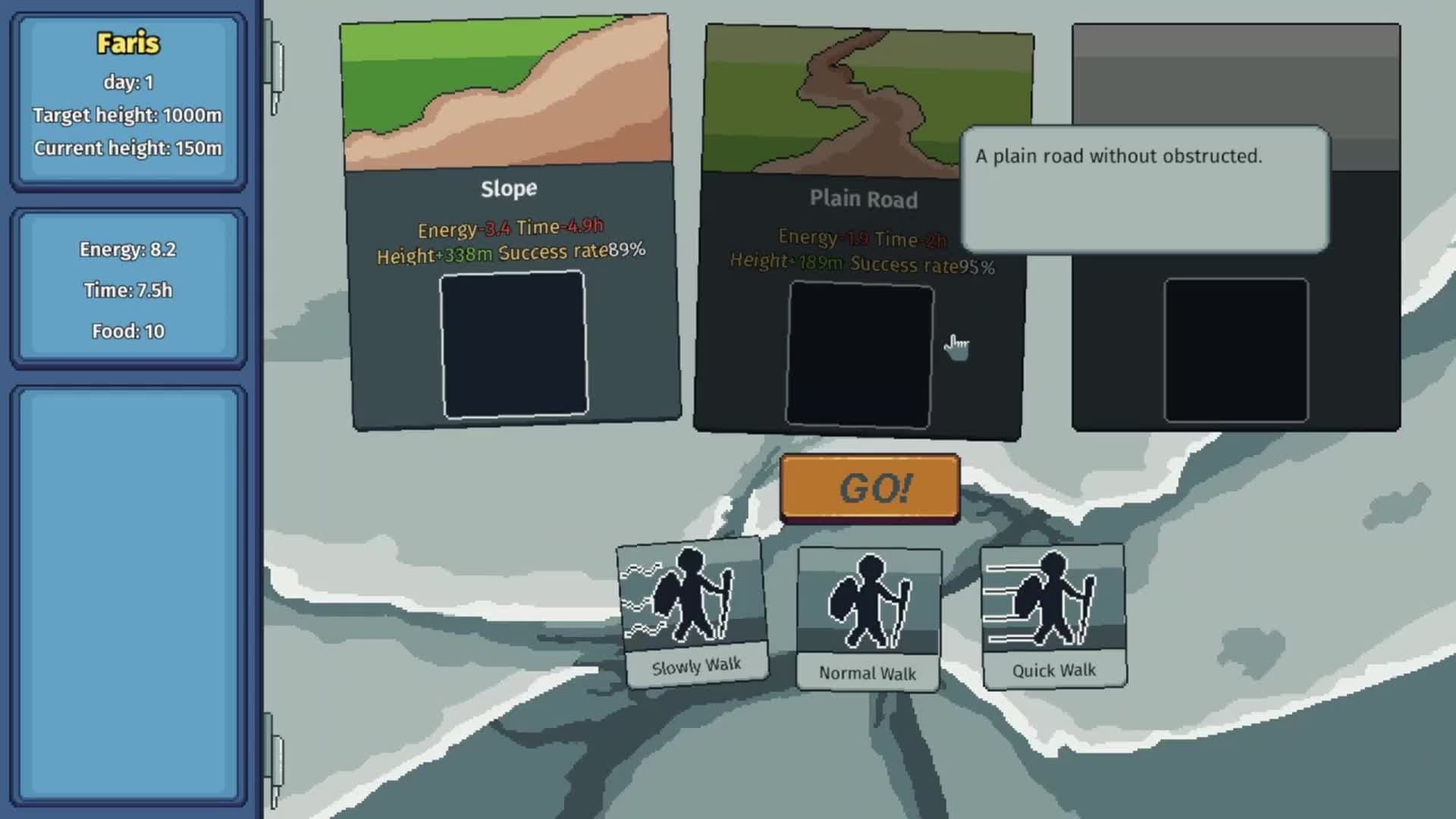 This is a lightweight mountaineering-themed strategy game. You need to allocate your physical strength and time reasonably, plan your route, and successfully climb the mountain before you run out of food.