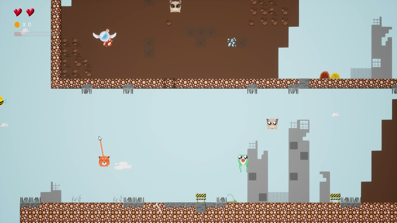 A 2D physics game. In the game,you will control a red panda or cat to defeat cunning greedy enemies, and protect kind animals and beautiful nature, by press release and drap mouse. Press left button of mouse or "P" key to pause game.