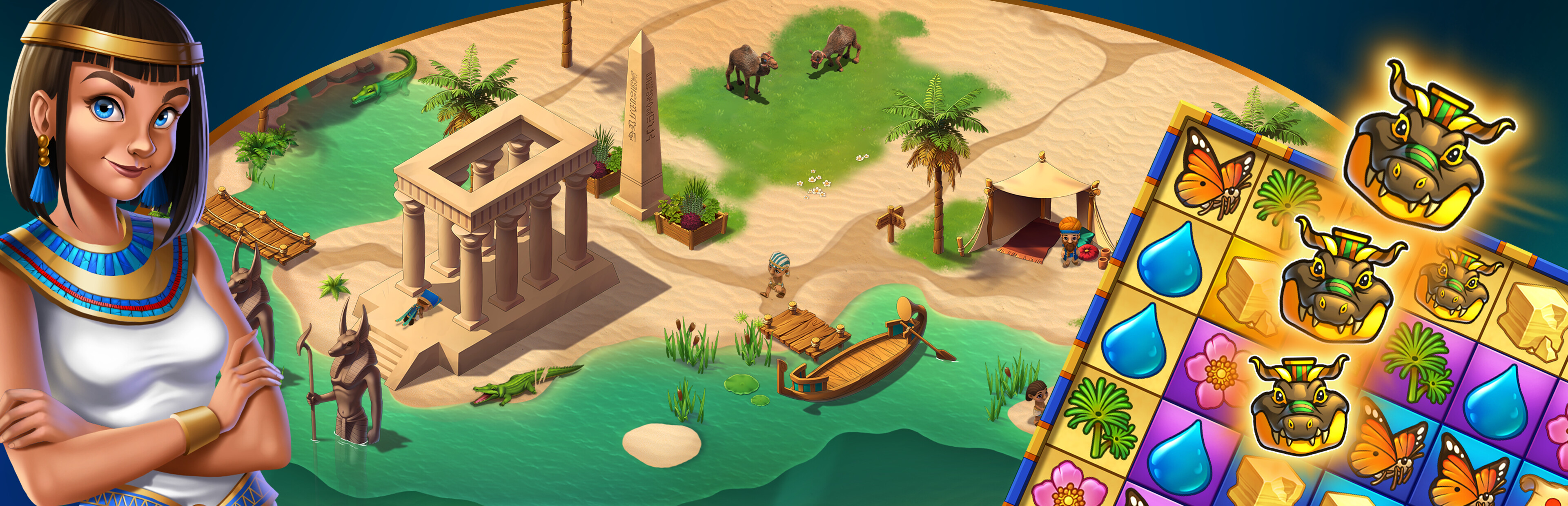 In this match 3 game, a new exciting adventure in ancient Egypt awaits you! A sinister curse has been placed on an oasis. Explore the mystery of the sacred crocodile and help it lift the curse and turn the oasis back into a thriving paradise.