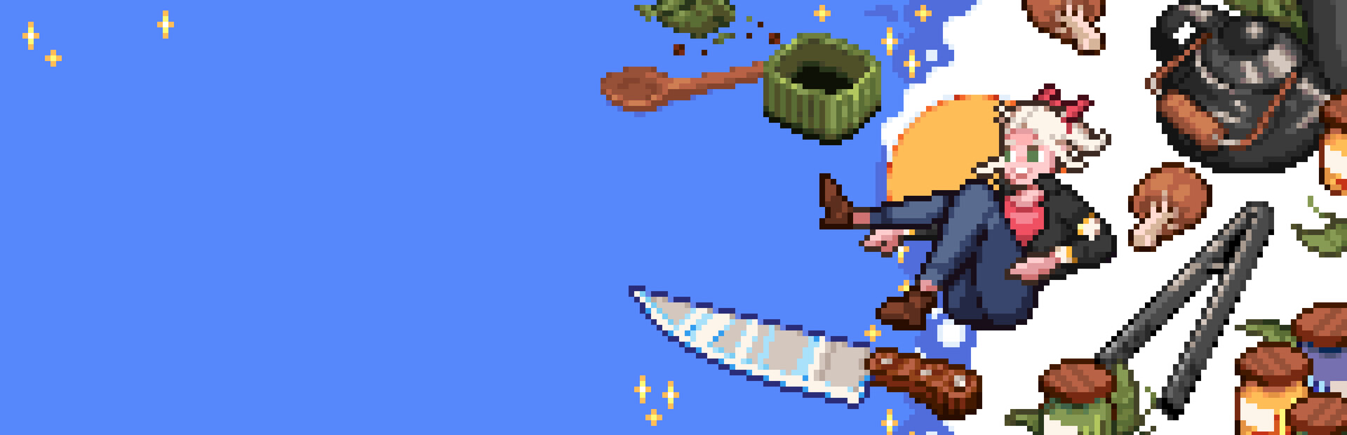 A magical pixel art platformer. Explore an unfamiliar town and deliver tasty treats to the townsfolk. Cook magical delicacies from your bought and gathered ingredients. Learn new ways to traverse, discover secrets, and figure out the intricacies of your orders.