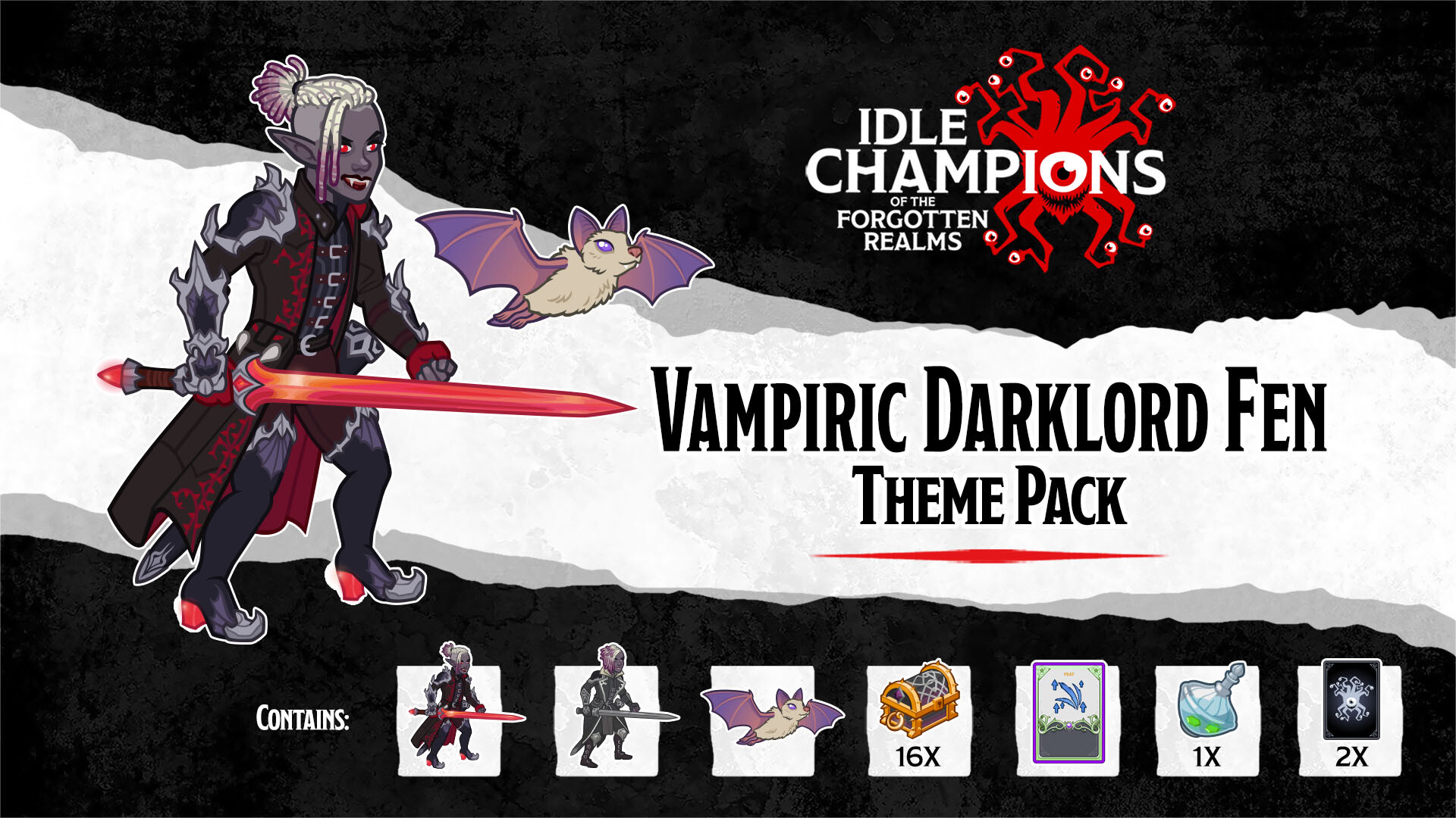 In this pack: Unlocks the Champion Fen (if you don't already have them) Vampiric Darklord Fen Skin Izzy the Vampire Bat Familiar An Epic Feat for Fen 1 Epic Potion of the Gem Hunter 16 Gold Fen Chests with 2 Guaranteed Shiny Equipment Cards