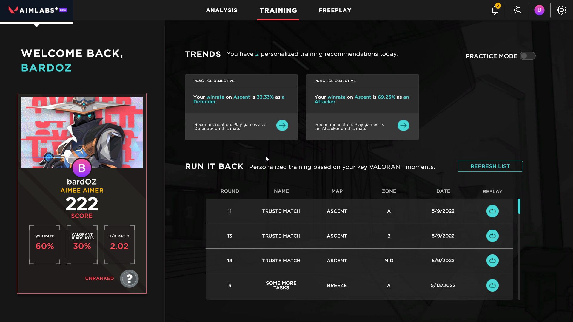 Aimlabs+ Basic Membership: Unlimited access to courses, VALORANT advanced training with personalized metrics & insights, and unique features like 'Run It Back' personalized tasks and crosshair placement visualizations.