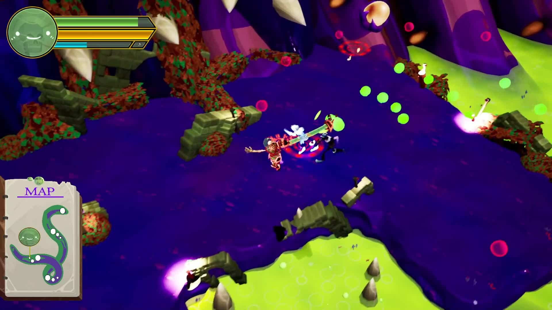 Use an extendable slime arm to “dissolve”, punch, grab, and throw enemies in order to save your slime brethren and navigate through the decrepit insides of an ancient Worm in this top-down hoard battler.