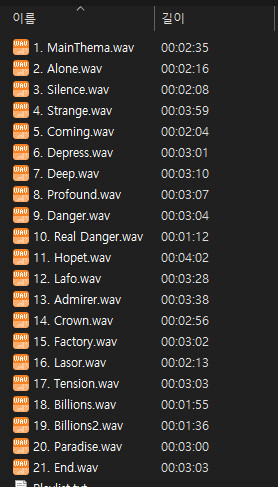 1. MainThema: VINE 2. Alone 3. Silence 4. Strange 5. Coming 6. Depress 7. Deep 8. Profound 9. Danger 10. Hopet 11. Lafo 12. Admirer 13. Crown 14. Factory 15. Lasor 16. Tension 17. Billions 18. Paradise 19. End