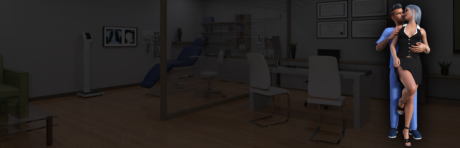 An interactive sex simulation game with visual novel elements, featuring high definition graphics and videos, with realistic-looking characters set in a beautiful decor. You play the role of a smoking hot doctor who has sex with three sexy women inside his private practice.