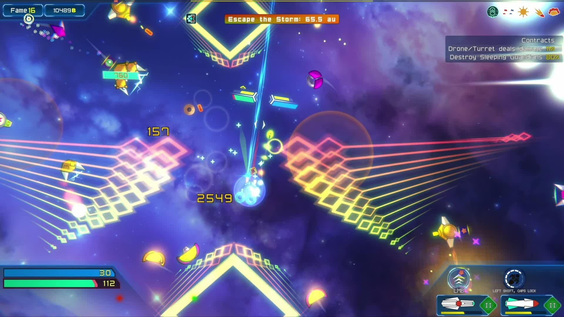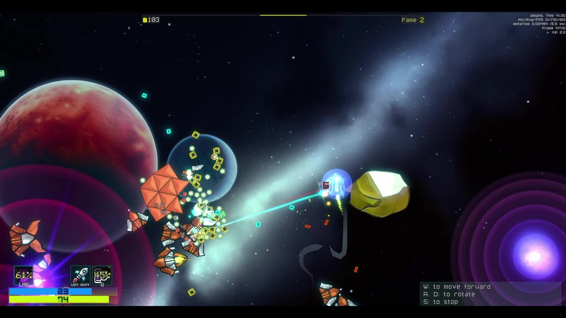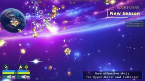 Physics based roguelite bullet-hell-and-heaven horde-survivor action game. Research and upgrade spaceship. Traverse procedurally generated galaxies with ability to alter its conditions and effects.