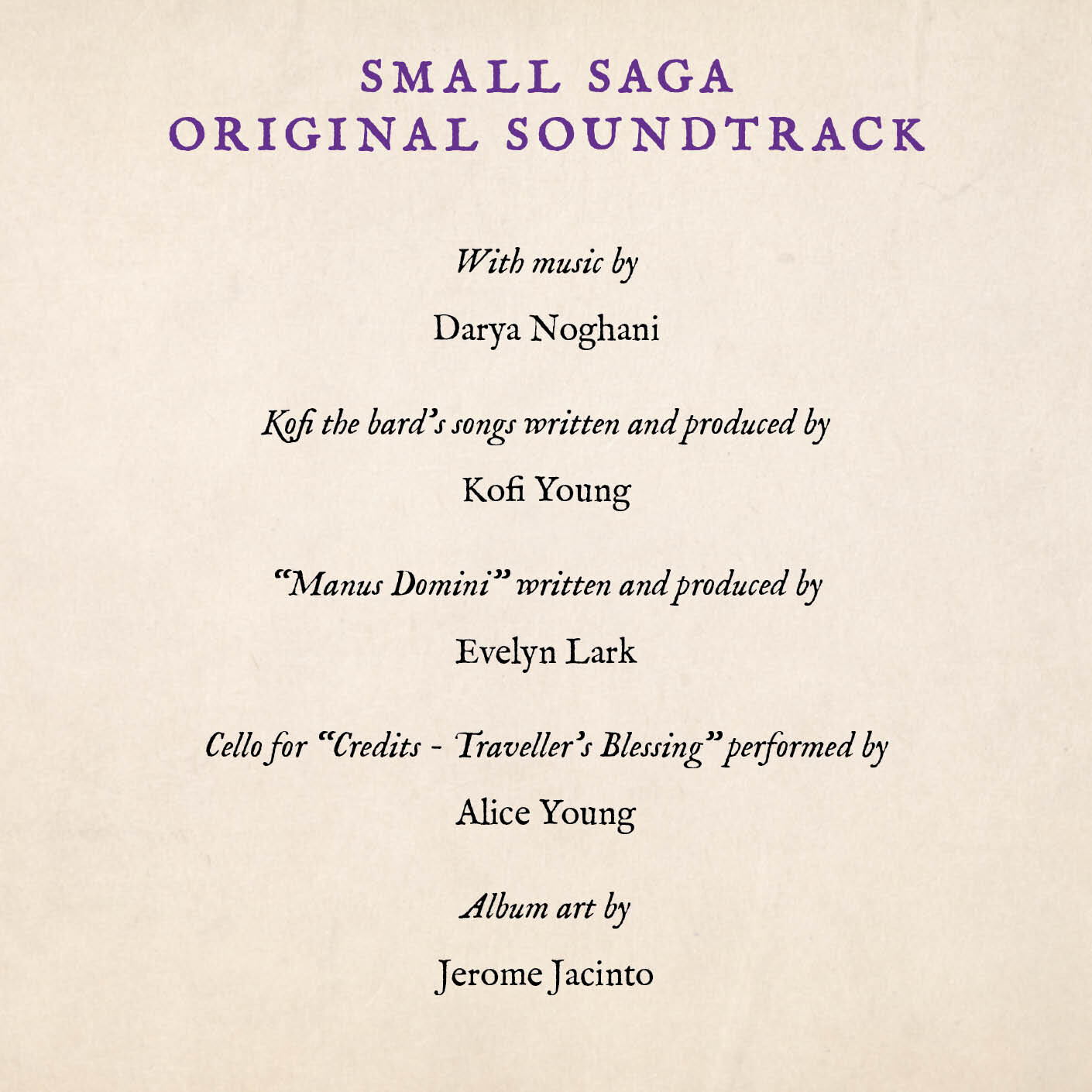 The full soundtrack for Small Saga! This album features 83 tracks of music by Darya Noghani, Kofi Young, and Evelyn Lark in high quality mp3 format.