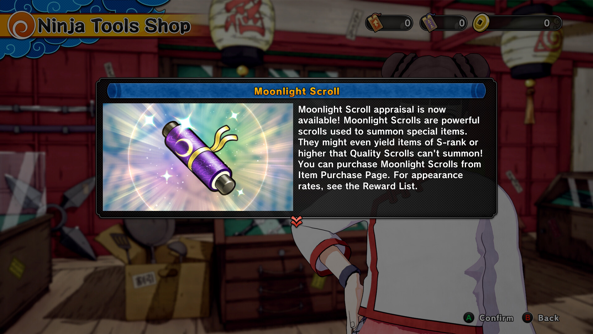 Moonlight Scrolls can be used to obtain different customization items for your avatar, including costumes, weapons, and Ninja Tools! As with other games in the series, scrolls can be unsealed by appraising them at the Ninja Tools Shop.