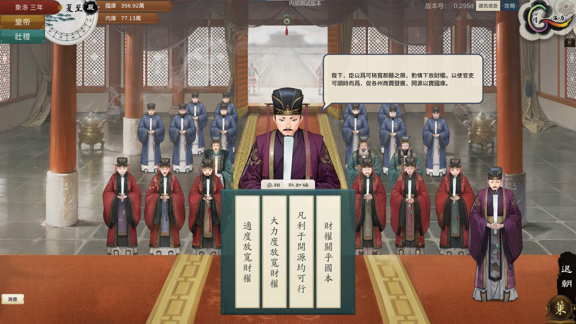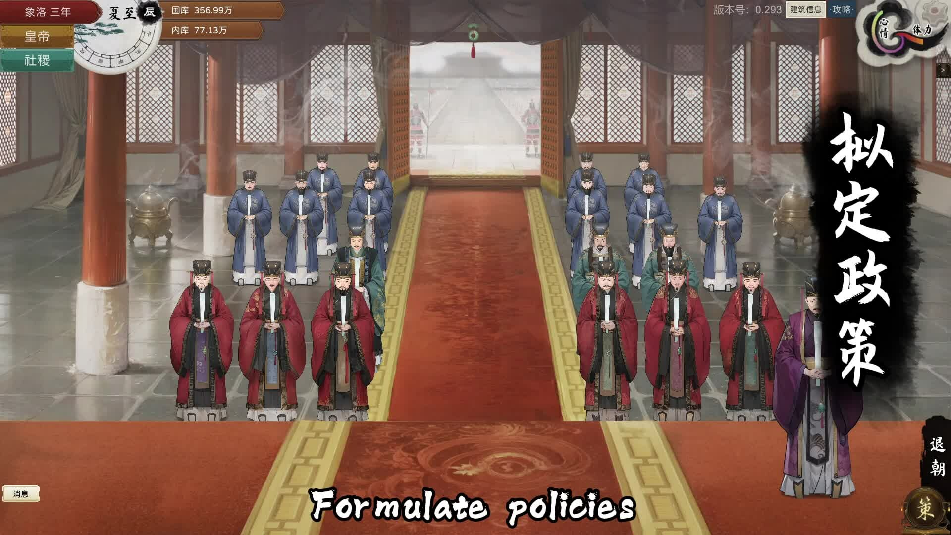 The Emperor and State is a turn-based strategy game that simulates the rule of an ancient feudal monarch. It involves the administration, policy adjustment, diplomatic checks and balances, national wars, as well as the emperor's self-cultivation, the cultivation of successors and so on.