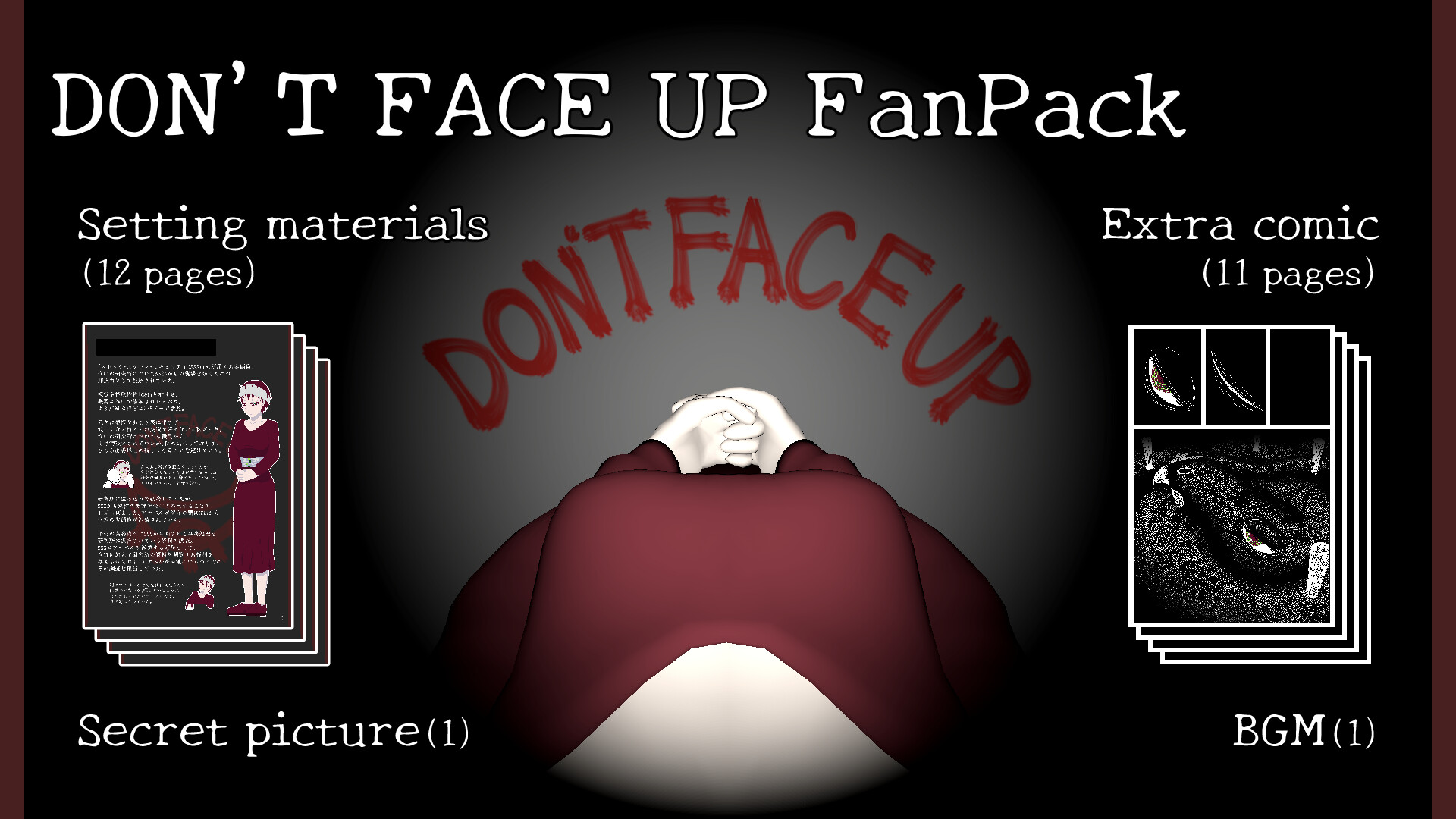 This is a collection of setting materials and extra comic for the free game "DON'T FACE UP" currently available on Steam. If you enjoyed the game and would like to support me, I would be very grateful if you would purchase this collection.