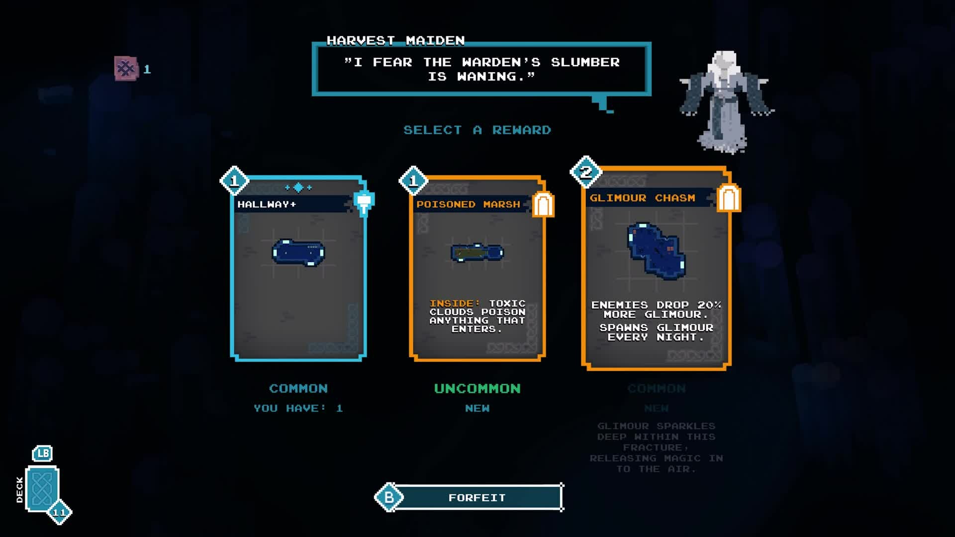 A roguelike deckbuilder where you create the dungeon you fight through. Each night use your cards to expand the ruins then battle through them, harvesting Glimour from the lost souls and improving your deck. Can you reach The Warden and defeat it, so The Maiden will grant your heart’s desire?