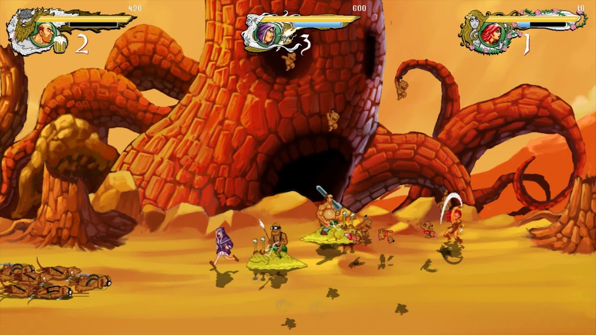 Dungeons the Eye of Draconus is a early 90’s arcade style, one to three player, comedy, retro brawler, with both local and online multiplayer support, complete with mounts; multiple attacks, and varied gameplay, all reminiscent of Battle Toads, Golden Axe and TMNT Arcade.