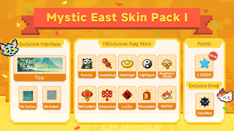 Join players worldwide in sweeping through 10 million mines across a 48 million tile minefield and leave your mark! The "Mystic East" Skin Pack I brings you a variety of game interfaces and flag options, giving you a unique Minesweeper experience.