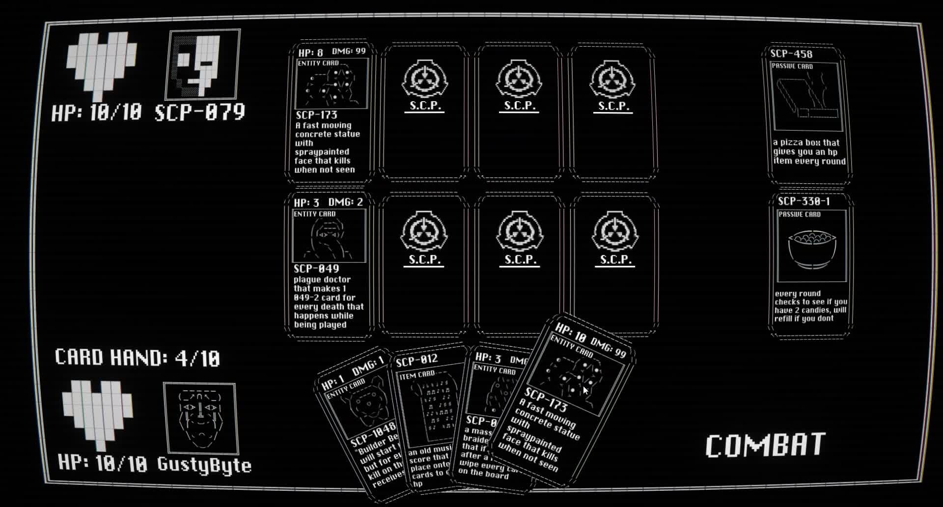 SCP: CARDTAINMENT BREACH is a single-player turn based deck building card game based on the universe of the SCP foundation. You play as D-9341 who has been trapped in a room by 079 but has promised that on finishing of the game will unlock the gates and allow you to escape