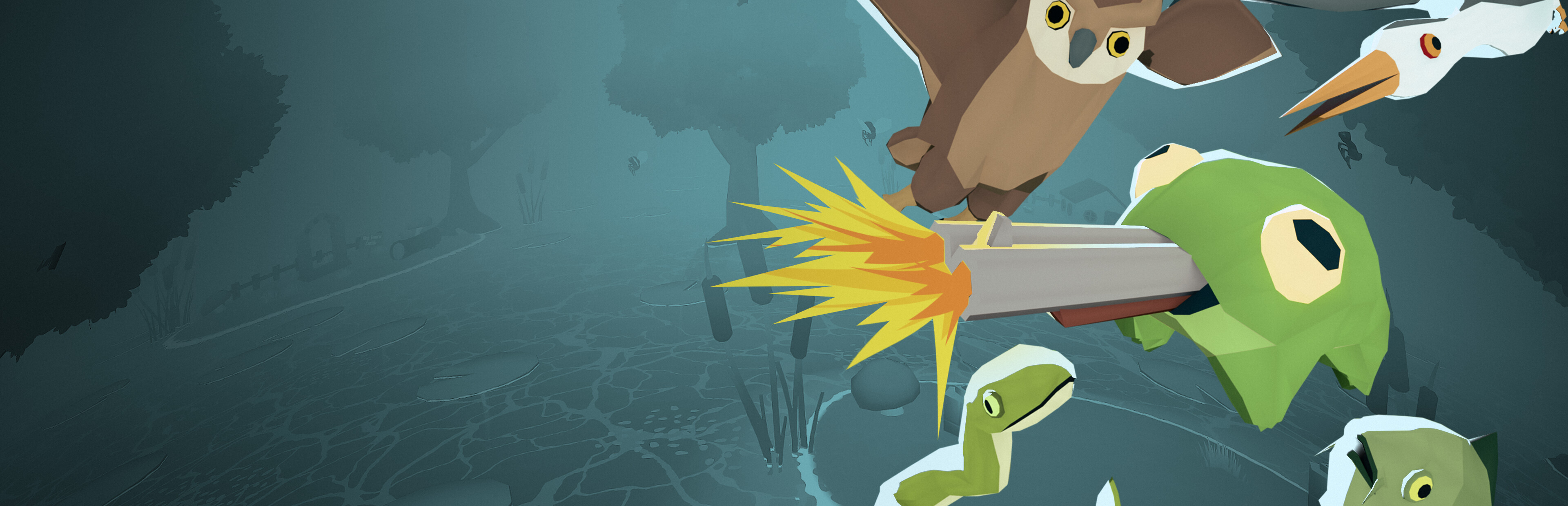 Gun Frog is a unique physics-based movement shooter where you bounce on lily pads, kill flies and explore a vibrant world as a frog that ate a gun.