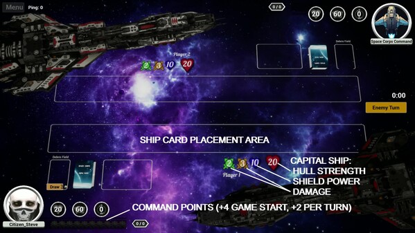 A collectible card game featuring spaceship combat. Take command of a capital ship and launch fighters, bombers and more to attack the enemy player's capital ship. Build your deck from one of four premium color card sets, or combine cards from multiple sets to create your own unique playstyle.