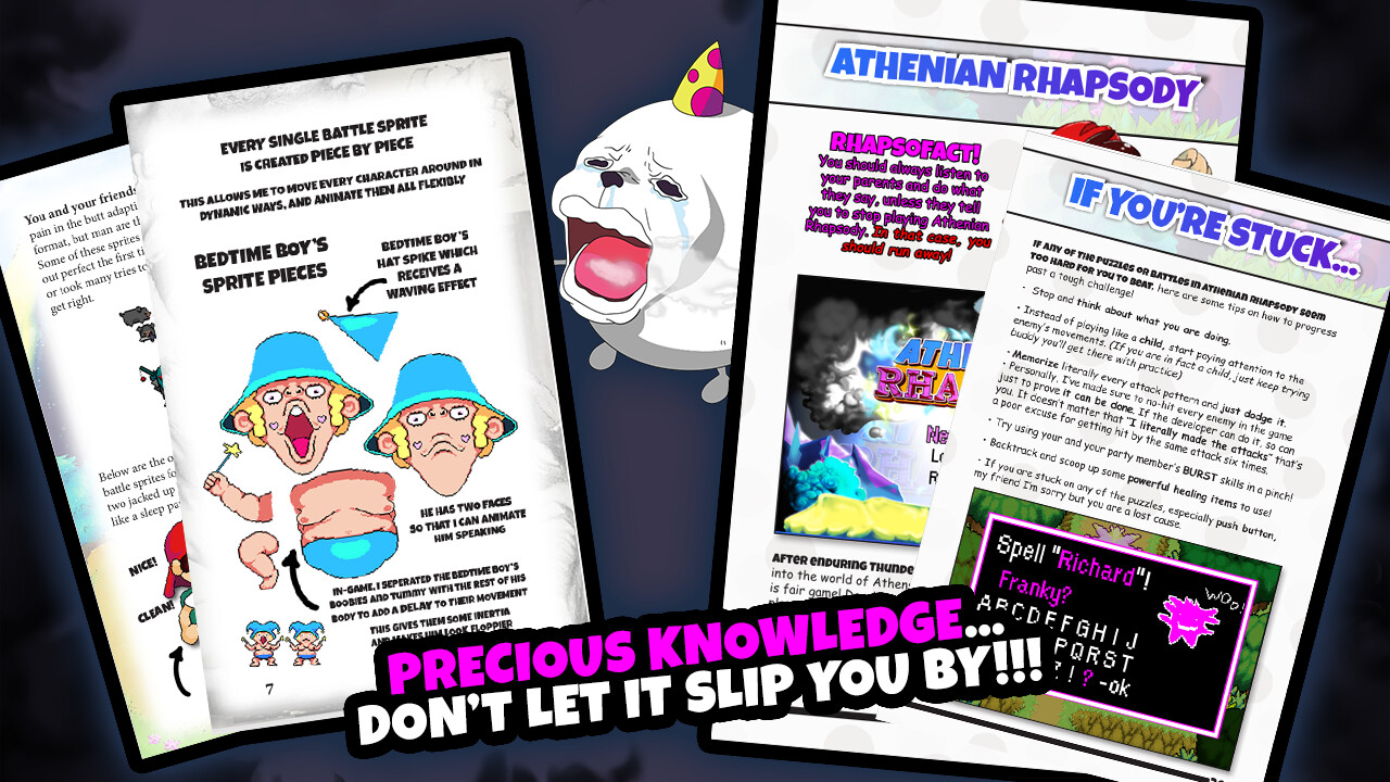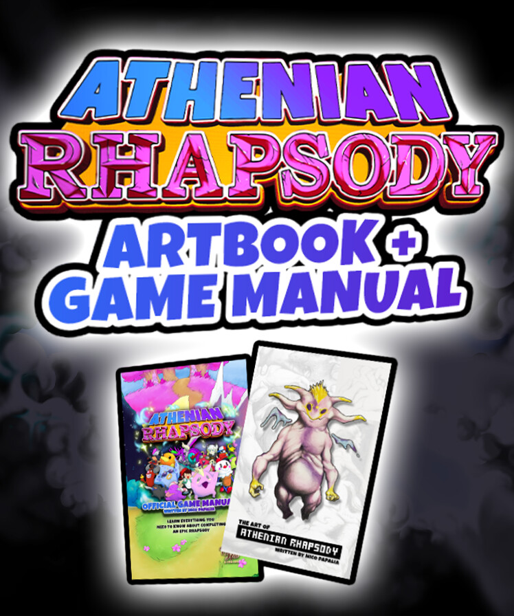This is the official Game Manual as well as Artbook for Athenian Rhapsody - in these books, you'll find lots of never before seen beta-artwork and character designs, information about the game, and insight on how the game was created.