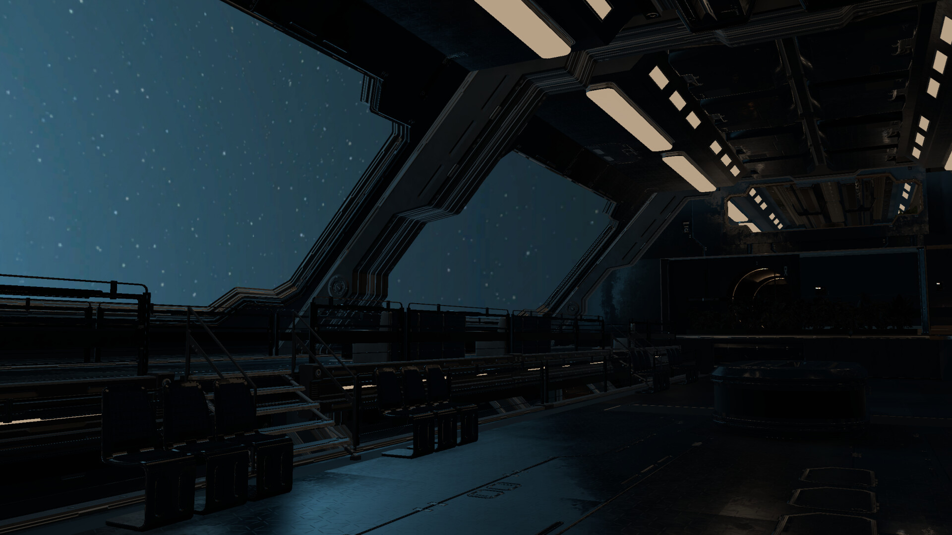 "Your departure has been delayed. Please enjoy our complimentary lounge to relax, work, study or sleep." Ambient Dark is a music experience. Listen to soothing ambient soundtracks and watch the spaceships silently glide past the window.