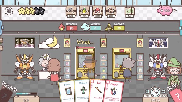 Manage a claw machine arcade in this cozy-but-evil management sim. Build rigged claw machines and play sneaky action cards to stop players from getting a prize! Build your arcade, design machines, compete against opponent arcades and face off against boss players to grow your arcade around the city!